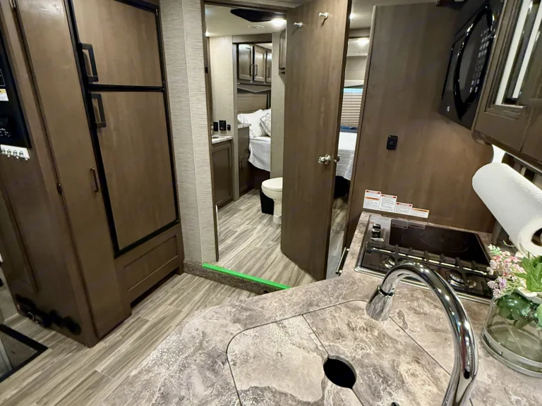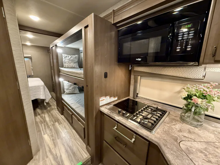 Spacious & Comfortable Living – A full‑wall slide significantly expands the kitchen and living area, providing plenty of room to move aroundMid-Coach Kitchen & Entertainment – Features a functional kitchen with a 2‑burner cooktop and 12 V fridge (with auto start function), plus a mid-ship Smart TV to keep everyone entertainedWell-Equipped Bath – Double-entry bathroom with a 32″ radius shower and tankless water heater for more efficient hot waterOutdoor Enjoyment – A 16′ power awning with built-in LED lighting creates a great outdoor space; some rental fleets offer an exterior TV optionLots of Storage – Offers roughly 55.7 cu ft of basement storage, plus ample cabinetry insideWho Is It Best For?