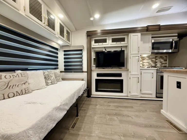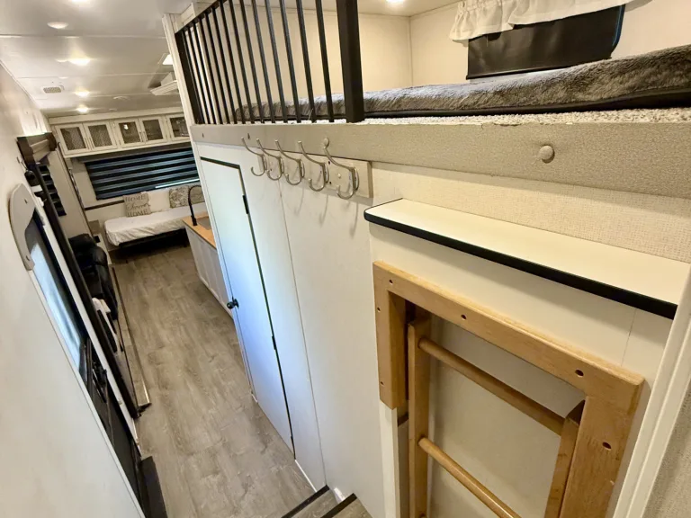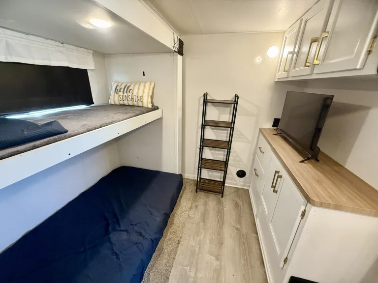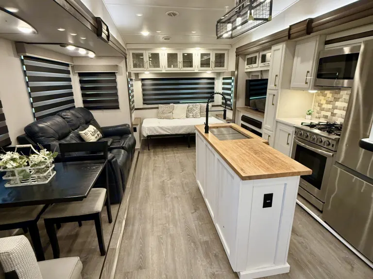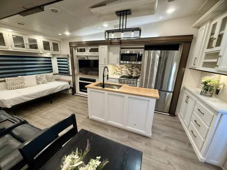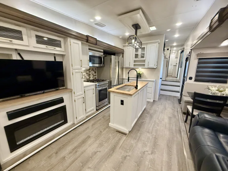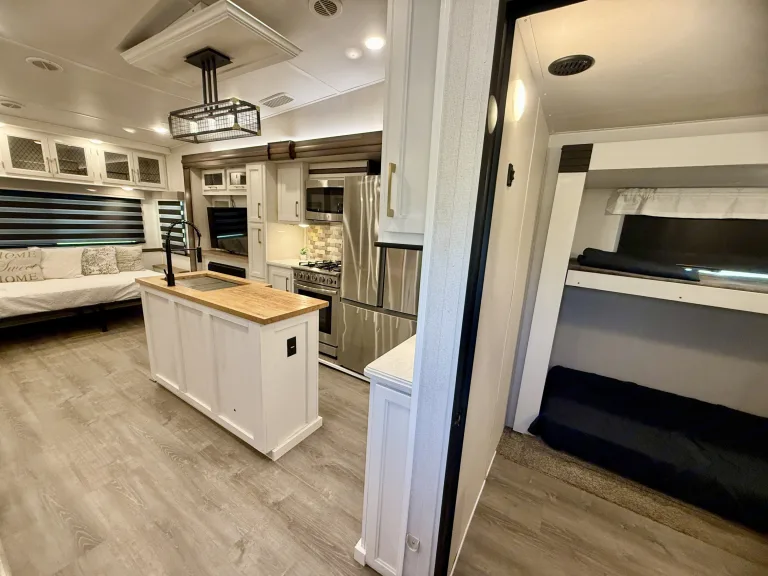 Rear Living Area: Theater seating, hide‑a‑bed sofa, booth dinette, and large LED TV—great for relaxing or hosting.Center Bunk Room: Features a bunk room and dresser—perfect for kids or extra guests. There is a loft sleeping space perfect for two kids located above the center bunk room.Front Master Bedroom: Queen bed slide-out, spacious wardrobe with washer/dryer prep, plus dresser storage.Kitchen: Island layout with butcher‑block counters, full-size 12 cu ft fridge, 4-burner cooktop, 30″ microwave, and two pantries.Outdoor & Utility Features