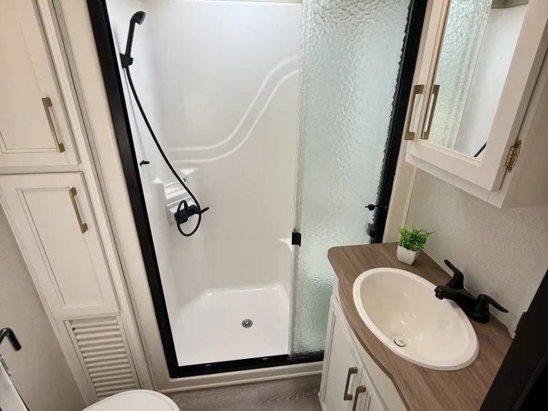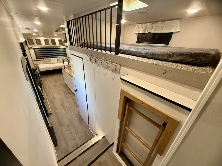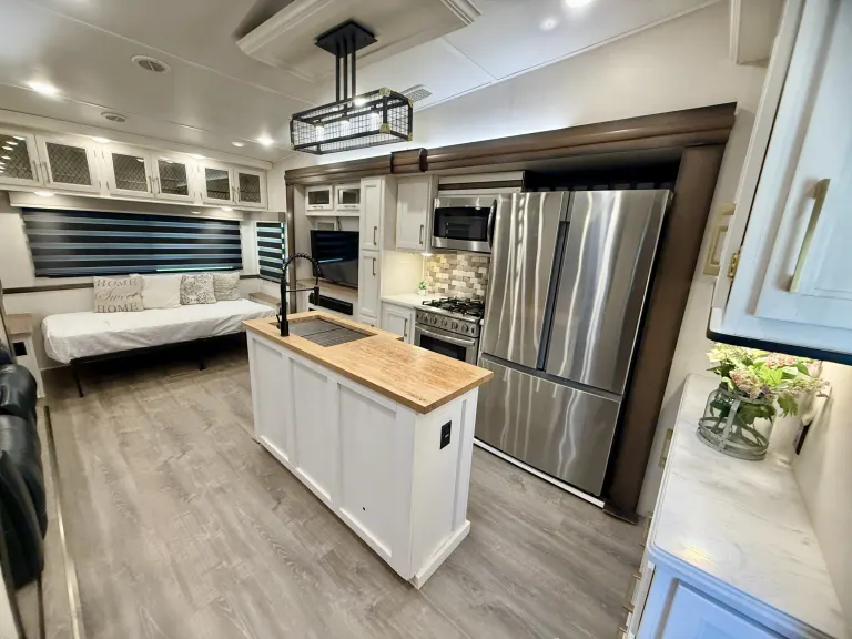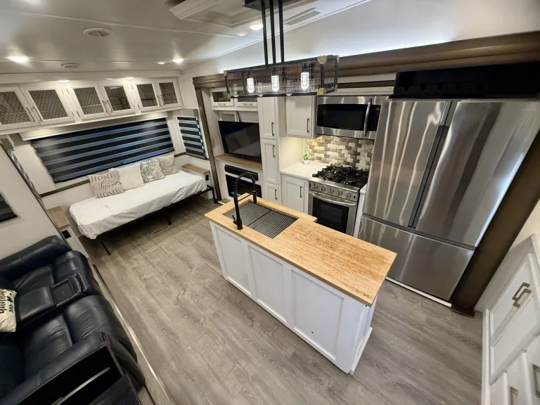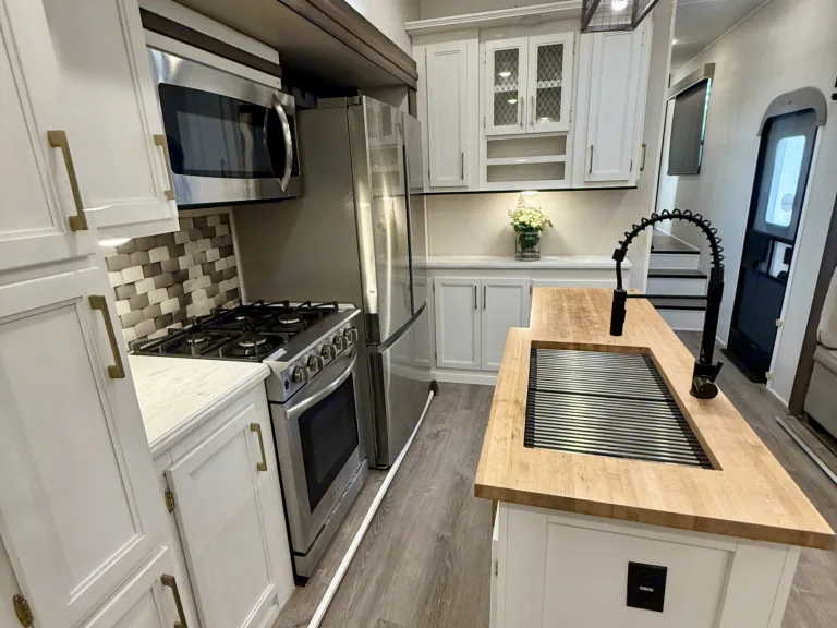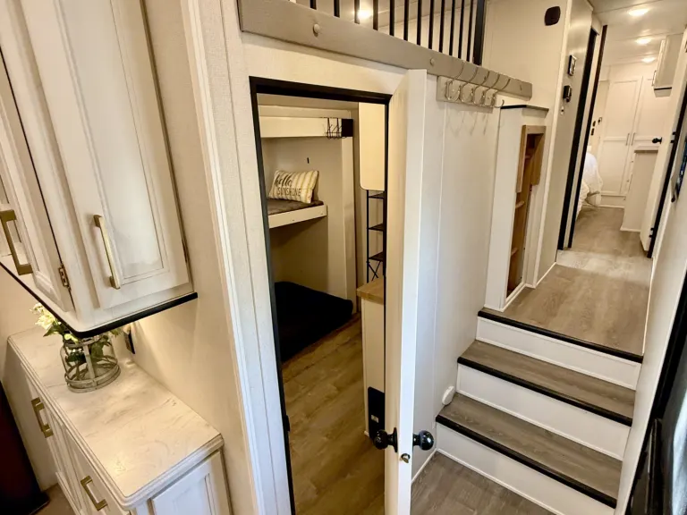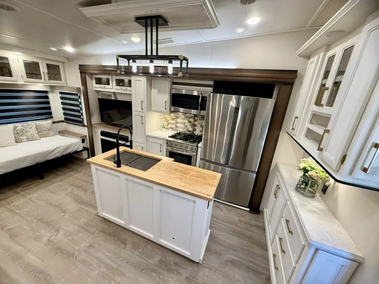 Rear Living Area: Theater seating, hide‑a‑bed sofa, booth dinette, and large LED TV—great for relaxing or hosting.Center Bunk Room: Features a bunk room and dresser—perfect for kids or extra guests. There is a loft sleeping space perfect for two kids located above the center bunk room.Front Master Bedroom: Queen bed slide-out, spacious wardrobe with washer/dryer prep, plus dresser storage.Kitchen: Island layout with butcher‑block counters, full-size 12 cu ft fridge, 4-burner cooktop, 30″ microwave, and two pantries.Outdoor & Utility Features