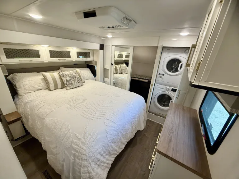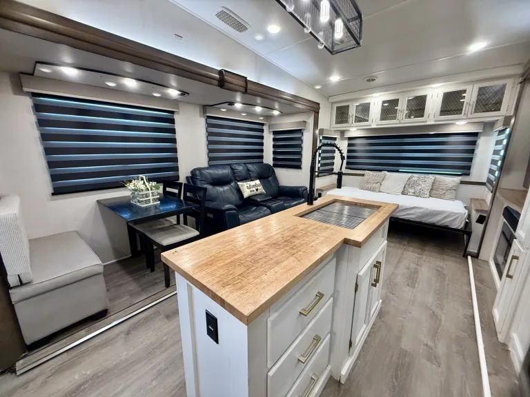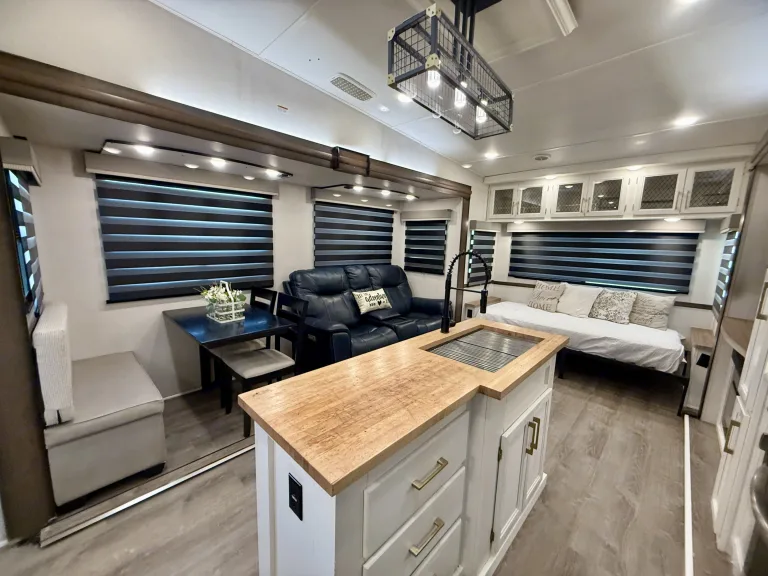 Outdoor Kitchen: Equipped with fridge and prep area under a 19' LED-lit awningConvenience: One-touch auto-leveling, universal docking center, bottle opener, and Doggy D-ring for your pet.