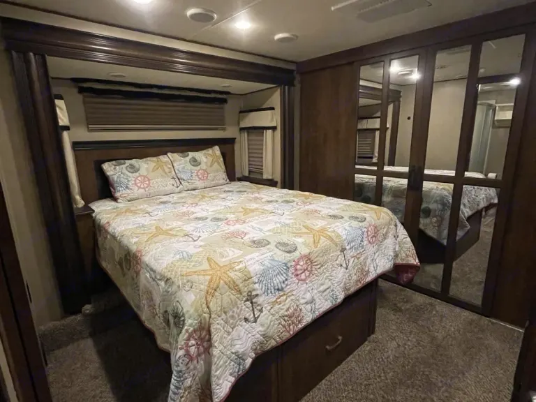 This fifth wheel is perfect for a couples getaway!Welcome "home" to the combined kitchen and living area with large slide out and dinette for those romantic or quick meals. Entertainment center with over-sized tv and fireplace to enjoy in a reclining loveseat. Kitchen equipped with residential refrigerator, three burner stove, oven, microwave, keurig and toaster.Master bedroom with queen residential mattress, tv, wardrobe and closet space for all of your belongings.