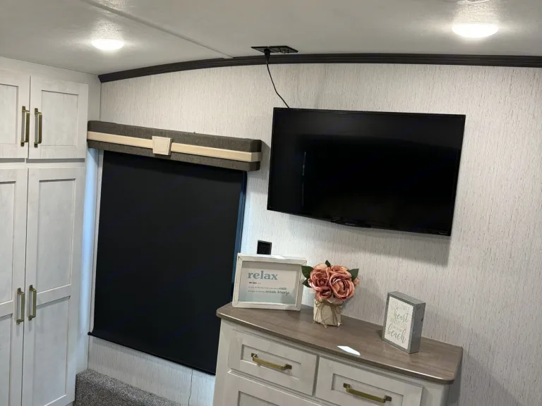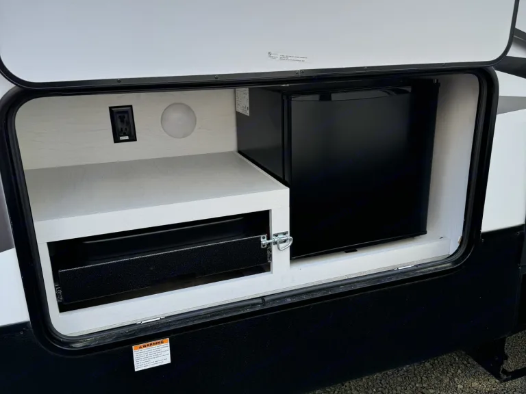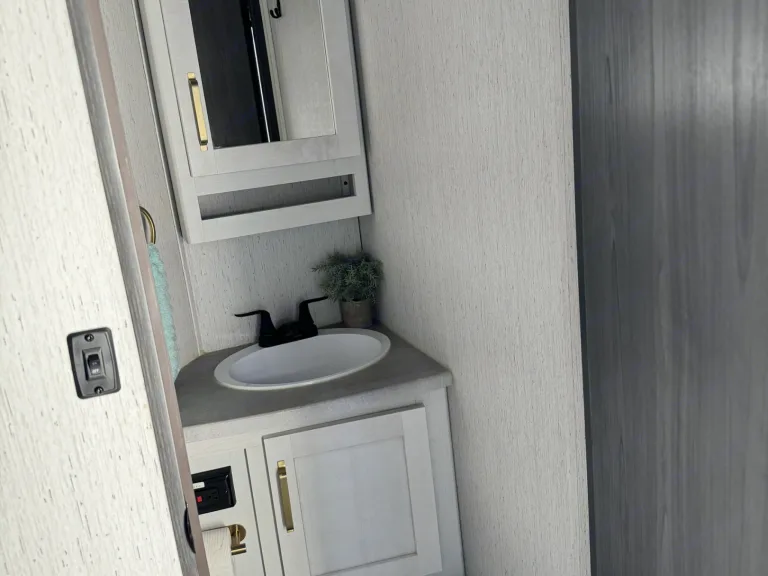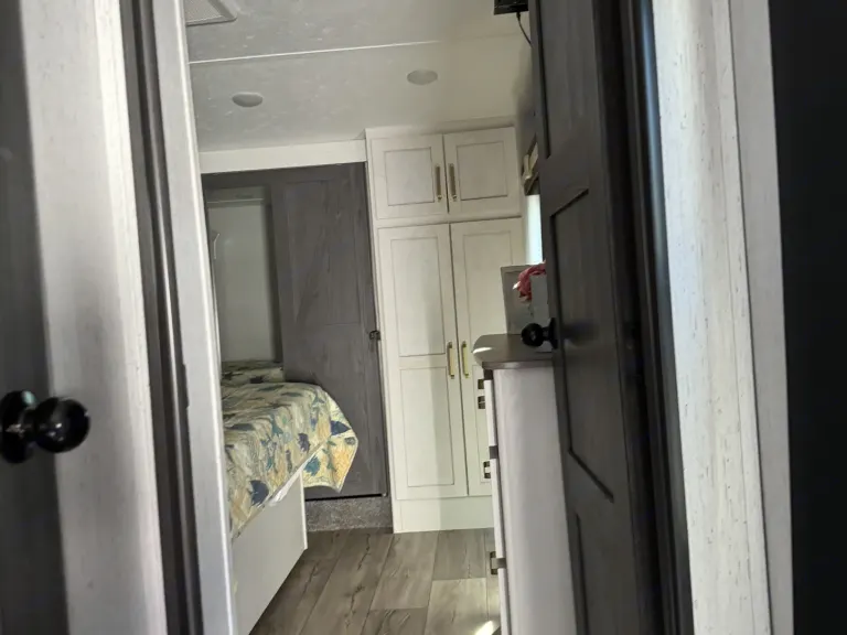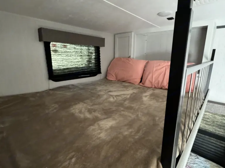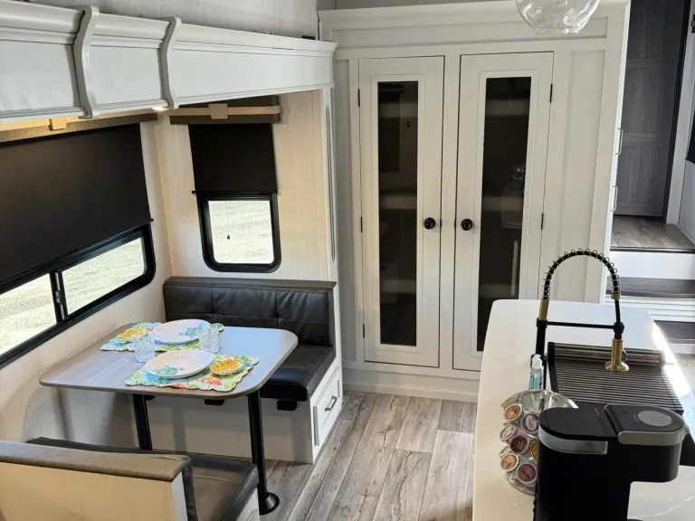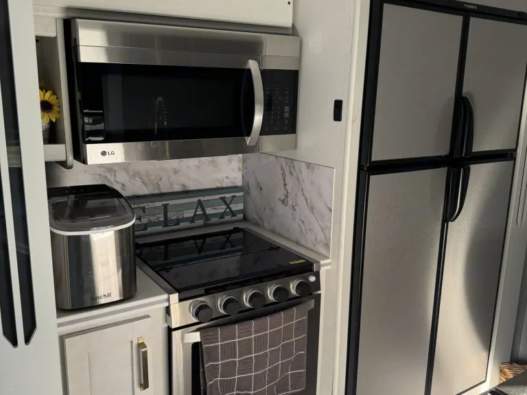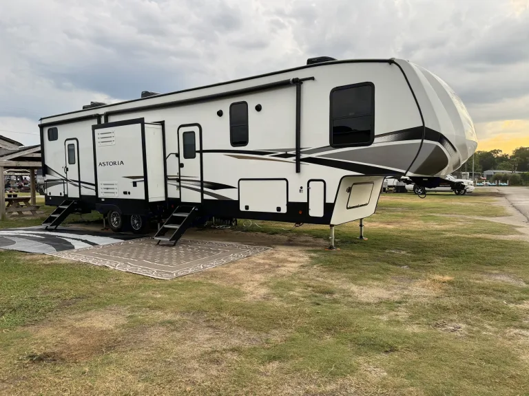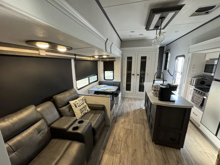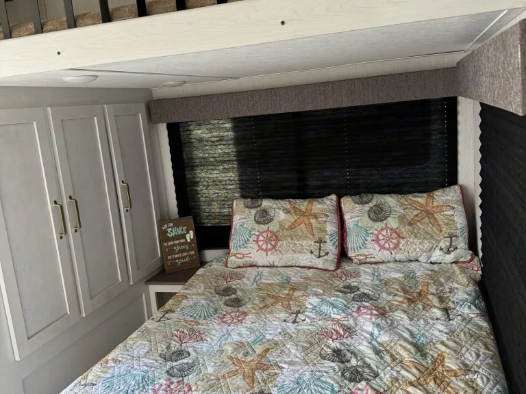 It's time to load up and head out with your in-laws and children to enjoy the great outdoors with your own accommodations a few steps away. The in-laws can sleep in the second bedroom in the rear on a full-size bed while the kids sleep above them in the loft with easy access up the ladder. You will have your own master bedroom on the opposite side with a king-size bed slide and a large wardrobe. You will have a full bathroom with dual-sink vanity near you while the others will have a half bathroom with easy access to the outside using the second exterior entry/exit door. You can relax inside in the combined kitchen and living area or outside in the fresh air. There is so much more to enjoy such as the four-door refrigerator, the theater seats, and the large pantry!Awning is not available for use - any tampering with the awning will result in losing your entire deposit as well as any costs to repair. We have provided a 10 x 10 pop up canopy to be used in its place. However, if camper is not occupied, high winds, or storms develop - it must be collapsed. Renter takes responsibility for replacement if used and any damage caused by the canopy. Canopy is NOT to be secured to the camper - there are stakes provided to secure in the ground.What's includedKitchen is fully stocked pots, pans, plates, bowls, cups, utensils, silverware, children's plates, cups, and silverware, keurig (including coffee), and a toaster. All linens, bath towels and kitchen towels are provided. A spacious shower and storage for all of your personal items. We provide toilet paper specifically made for RV's as any other paper can damage the holding tanks. Also included are outdoor rugs, camp chairs and more!RecommendationsRenters are responsible for reserving/paying for site. Site must be at least 43 ft long and wide enough for opposing sides. Make sure to ask about trees on site as fifth wheels are tall. We are NOT responsible if the camper does NOT fit on the site and will NOT attempt to put it on a smaller site. 50 AMP hookup required. CAMPER IS DELIVERY ONLY. Other things to note***NO SMOKING OR VAPING INSIDE OF CAMPER