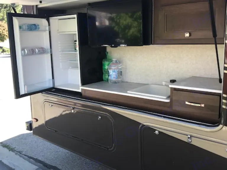 it also has an outdoor kitchen with sink, lots of storage and a small fridge [works only when plugged in or the generator is running].More than enough space for up to 8 to sleep. A comfortable queen bed in private rear bedroom with two closets and a few drawers. The above cab provides another spacious queen sleeping area, with a privacy curtain. Sofa has foot rests and converts to a bed to sleep an additional 2 people. The dinette also converts to a bed for an additional 2 people.Tow package!We're so excited to share our little slice of paradise with you!What's includedWHATS INCLUDED:KITCHEN/COOKING