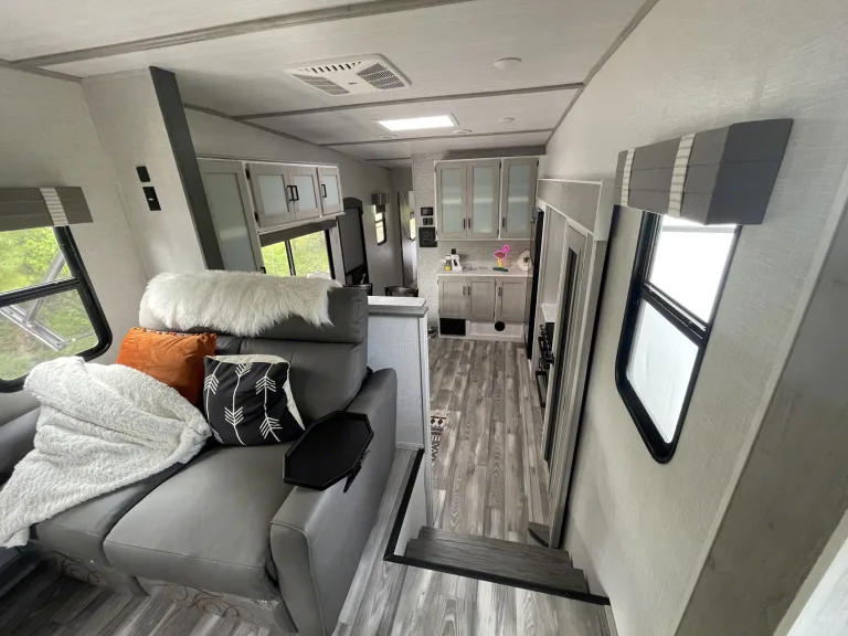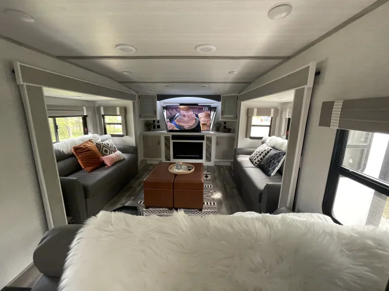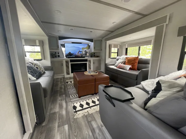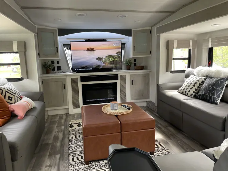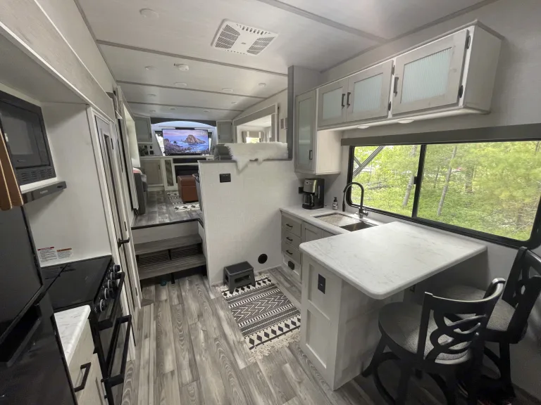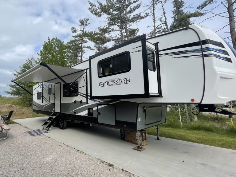Beautiful separate living room and sleeping area fifth wheel. Private bedroom with rear window view. Front area has dual slides, theater seating, with a 50” LED TV with sound bar. Fireplace and a storage area on either side with games. The kitchen is centrally located with a breakfast bar with swivel bar stools to dine at. Dual air conditioning for the front and back area. The outside also offers an outdoor shower area.What's includedCamping chairs. Fresh linens, towels, silverware, dishes, small appliances, Keurig coffee pot, extra blankets, indoor games. Pick up and drop off of fifth wheel to many of the area campgrounds. You secure the site and we deliver and pick up. Must be out and ready 1 hour before check out for pick up. RecommendationsLocate one of our beautiful campgrounds around the Marquette county, and or surrounding areas and we will haul the camper to your location. The area offers beautiful scenic lakes for swimming, and some of the country’s best hiking and biking trails. Pictured rocks in Munising is close by as well as beautiful Presque Isle and black rocks in Marquette. Hike up the trails at Sugar loaf, or hogs back. Also Marquette offers some amazing dining, and brewery options.