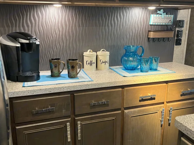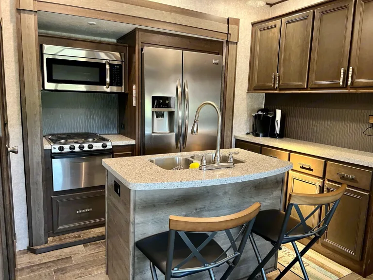 Our 5th wheel may be a 2017 model but you'd never know it, it's in excellent condition. The perfect size for a large family or group with two bedrooms and two bathrooms. This model is sporting some high end upgrades such as granite counter tops, a coffee bar, stainless steel appliances, a fireplace, residential size fridge with ice & water in the door. Plenty of storage too for everyone's camping equipment. Oh but that's not all...outside is an oversized outdoor kitchen that is sure to be a crowd pleaser. We look forward to meeting you soon and feel free to reach out with any questions you may have.What's includedWhat's included: