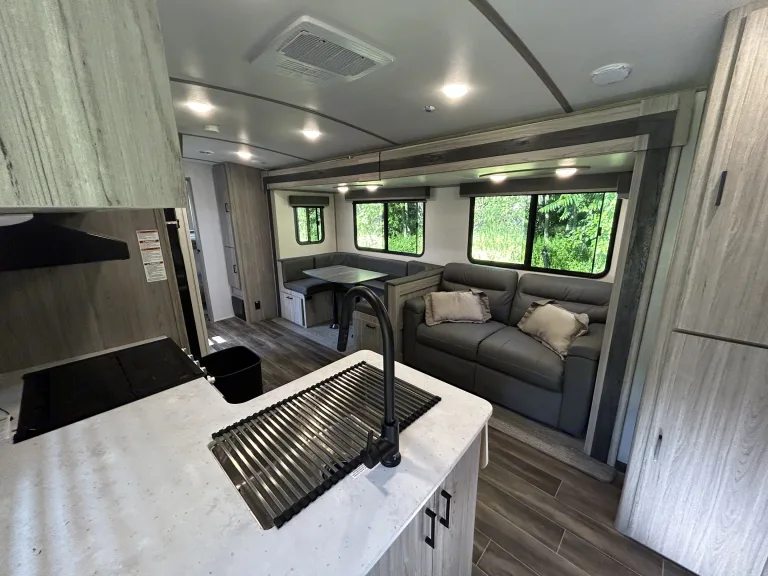 Beautiful 2022 Passport travel trailer. Sleeps up to 14 people. Stationary rental on private 3.5 acre property.Rare travel trailer with a quad queen bunk house that sleeps up to 14 people! Sets on a beautiful 3.5 acres of private property. Wake up every morning to the sound of birds chirping. Enjoy your complimentary morning coffee under the huge pavilion, and maybe catch the local wildlife grazing in the yard.Make yourself at home with all of our provided activities, such as: horseshoes, volleyball, badminton, kickball, wiffleball, propane grills, fire ring, and more!What's includedEverything you need is included, EXCEPT for: