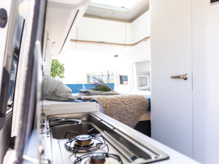 The interior is modern and fresh, with a cozy and spacious seating group with an extendable table and 2 luxurious swivel pilot chairs. For sleeping - 2 sleeping places at the back in the fixed transverse bed (approx. 1.40 - x 1.93 m) and 2 upstairs in the pull-out top bunk. allowing you to sleep 2, 3, and 4 people.Full Equipment