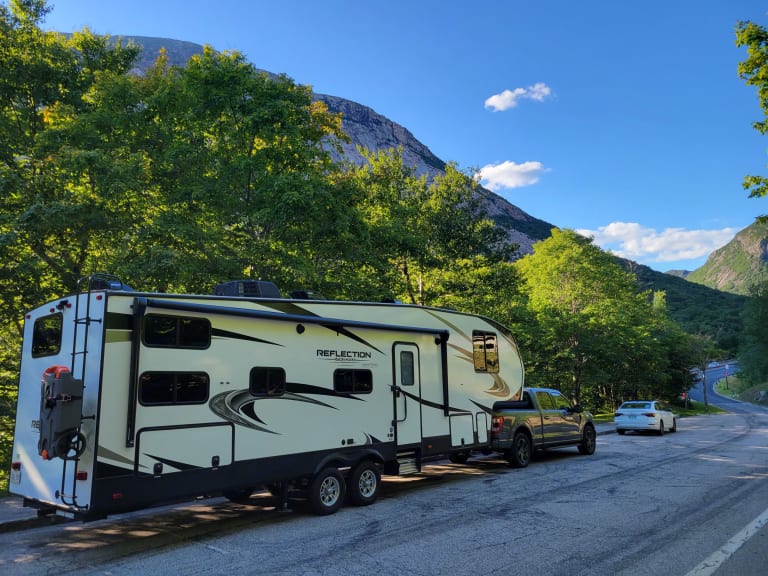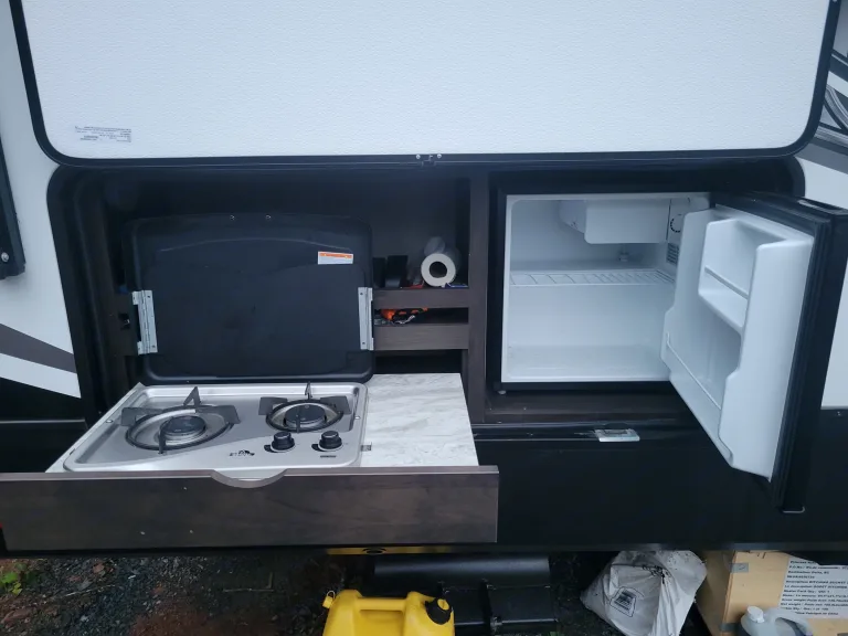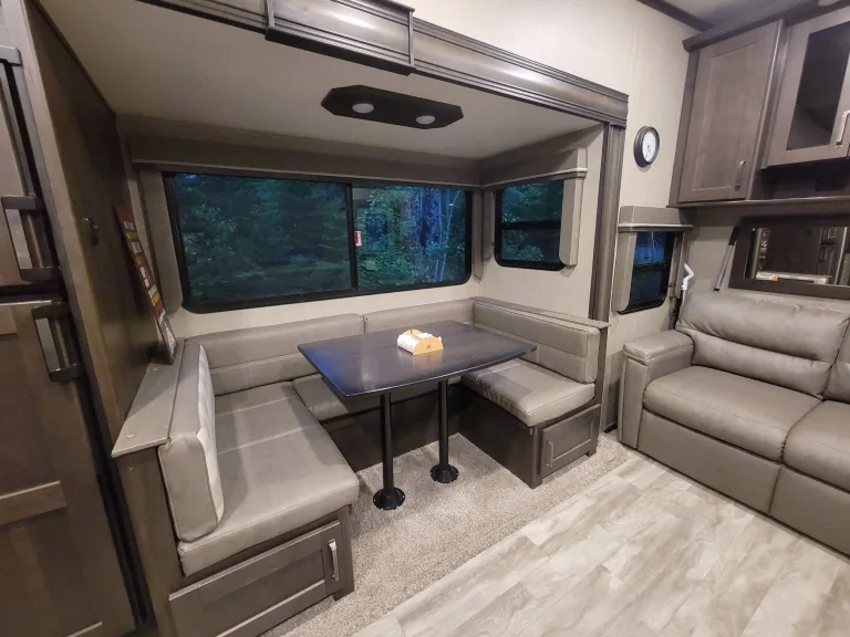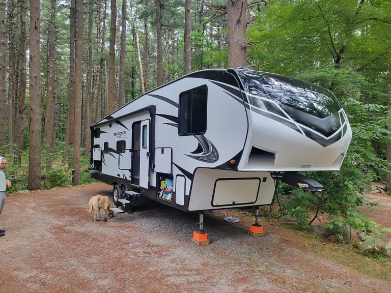 Outdoor Table and side tableIf camping on a site without sewer, we would suggest adding our black tank tote so you can have the black tank emptied before pickup. If the black tank is full on pickup there will be a fee charged to empty it at the campground or elsewhere.Please BE Aware, Delivery IS Mandatory, Customer Pickup AND Drop OFF IS NOT Permitted.What's includedFully stocked kitchen, with coffee maker, toaster, ice maker and panini press. Full linens for the kitchen, bathroom and beds are available as an add-on with the rental. Outside, a portable bbq and propane fire pit are available for an additional fee. Pickup from Halifax Stanfield International Airport, and a ride to your campground or place of stay is available upon request. Pickup of the trailer is not offered, delivery only. Please contact me to inquire into delivery and pickup availability. Camping chairs are not included in the rental.RecommendationsConfirm your campground site is suited for trailers 34ft or greater. I would highly recommend booking the largest site possible, as these trailers are not easily 'crammed' into sites. In addition, 50amps in best for this trailer, but it can run with 30amps at a minimum if you are wanting to use the AC. No power is unfortunately not an option for this unit as the onboard batteries will not last for very long. A generator hook up will work as well for powering the trailer. Other things to noteDogs are allowed in our trailer, but please no cats. Please keep your furry friends off of the furniture as we don't want their nails to puncture the material. Our daughter is severely allergic and we still enjoy using our trailer as a family. Smoking inside the trailer is also strictly prohibited. If the trailer is being used for a festival, please confirm with me the details of your stay and what festival it is.