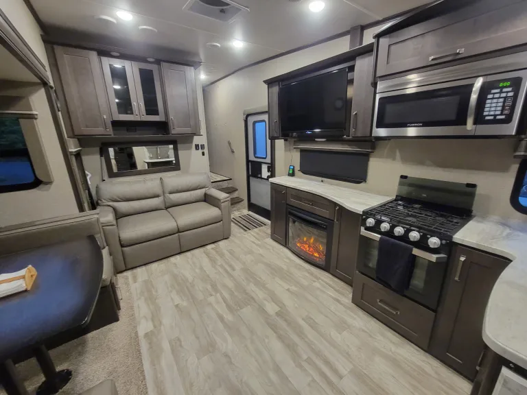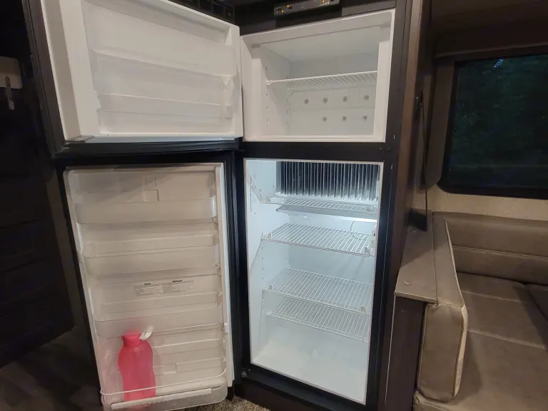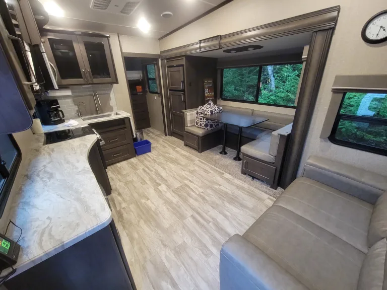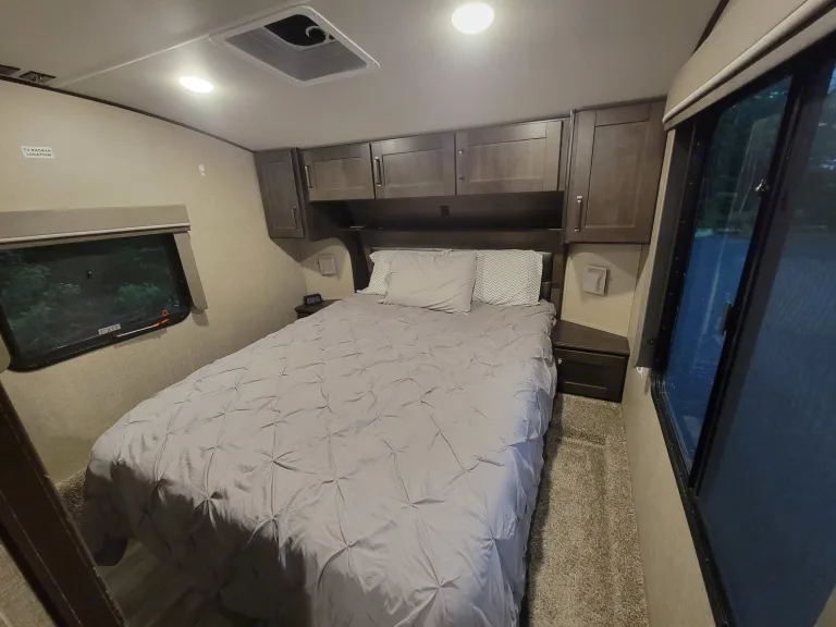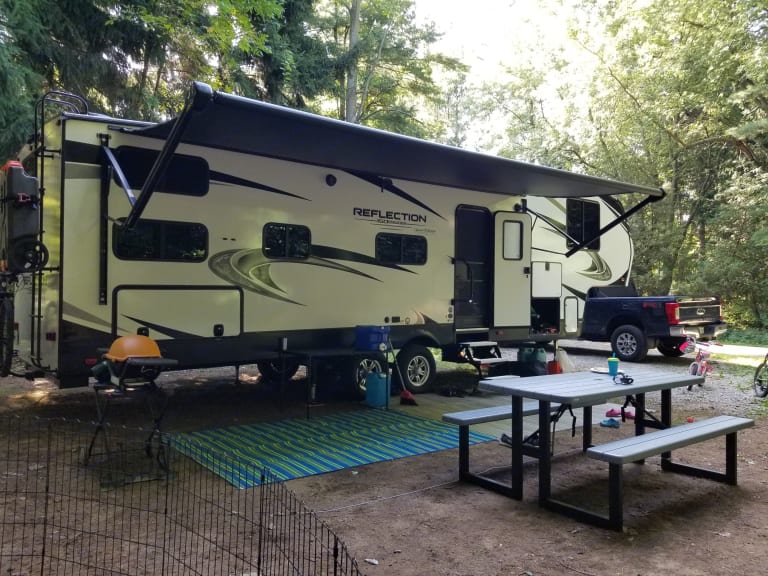 34ft 5th wheel with high end finishes! Sleeps 10 (8 with ease), with the private master bedroom featuring a full queen sized bed. Equipped with a 42" TV in the living area and a small TV in the rear room for those rainy days. Indoor and outdoor radio and bluetooth stereo to enjoy all the music and tunes needed for a great time. A full size toilet and generously sized shower compliment the bathroom. Tons of storage everywhere for all of your vacationing items, and an outdoor fridge for the vacation beverages tops it all off. This is a very clean, smoke free trailer, ready for those who want to do a little more Glamping than camping. That being said, there is an outdoor shower for those moments that get out of hand. Trailer comes equipped with an outdoor carpet and 4 camping chairs to make the space under the retractable awning just a little nicer. Portable Webber BBQ, portable propane fire pit and a portable generator are available adds-ons for a little extra enjoyment and peace of mind. Dogs are allowed, but we ask that they are kept off the furniture and trailer is thoroughly cleaned before pickup. Cats ARE NOT Allowed Under ANY Circumstances, AND Smoking IN THE Trailer IS Prohibited. For air conditioning to work, 30amp site service is required at minimum. 50amp is ideal for this trailer. In addition to what has already been listed, the rental comes with the following:Coffee Maker