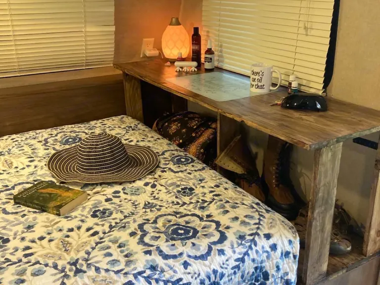 Cute as a button, and ready for adventure! This bunkhouse gives just enough room for 4 people to sleep comfortably, without the added stress and expense of a larger floor plan. The full size bed has a Sealy Full size mattress for added comfort, and just begs you to enjoy breakfast in bed! The two bunks in the back give additional space for up to two more campers, or simply overflow space for all your hiking gear.The kitchen features a two burner stove, one small non-stick pan, small pot, and a collapsible table that can be used on the bed as a breakfast tray, or you can pop the legs on and set it up next to the bed! There is also an adorable retro microwave, drip coffee maker, mugs, and basic cooking utensils. Bring some disposable plates/bowls and utensils, and you have everything you need!Our little “house on wheels” is equipped with pillows, sheets and towels, and one throw blanket per person.Please note, you will want to bring in your own toiletries and food! No coffee, tea, oils, or spices are provided at this time.What's includedThe kitchen: