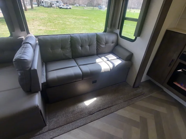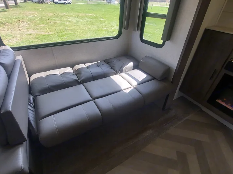 This is a great camper to get away with the family in and make some great memories. Very spacious, with almost every amenity you could possibly need. Large refrigerator and freezer, gas range with oven, microwave, and grill attached that runs on the camper propane. Large awning and an outdoor kitchen allow you to prep and make meals inside or out. Camper has a queen size bed in separated master bedroom, two twin size loft beds in the rear, with a third bed converted from the mini dinette table. U shaped dining table converts to another twin bed, and the couch folds down into a flat sleeping area suitable for a younger kid (or really short person). There is A/C and heat. As well as an electric fireplace to add to the coziness of the camper.
