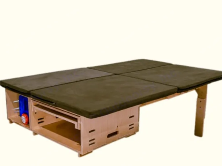 Modular wooden sleeping platform for RV rental or van life, featuring cushions, storage, and an adjustable leg.. Dodge B Van 2008