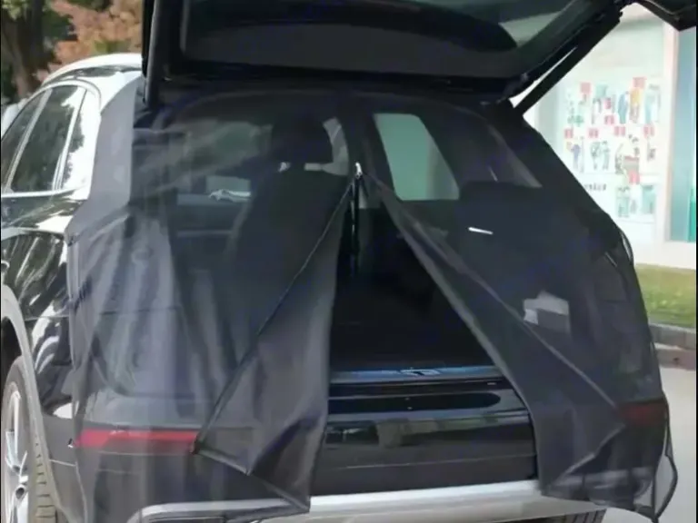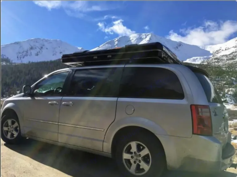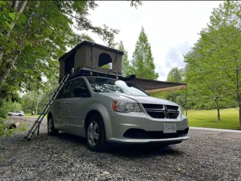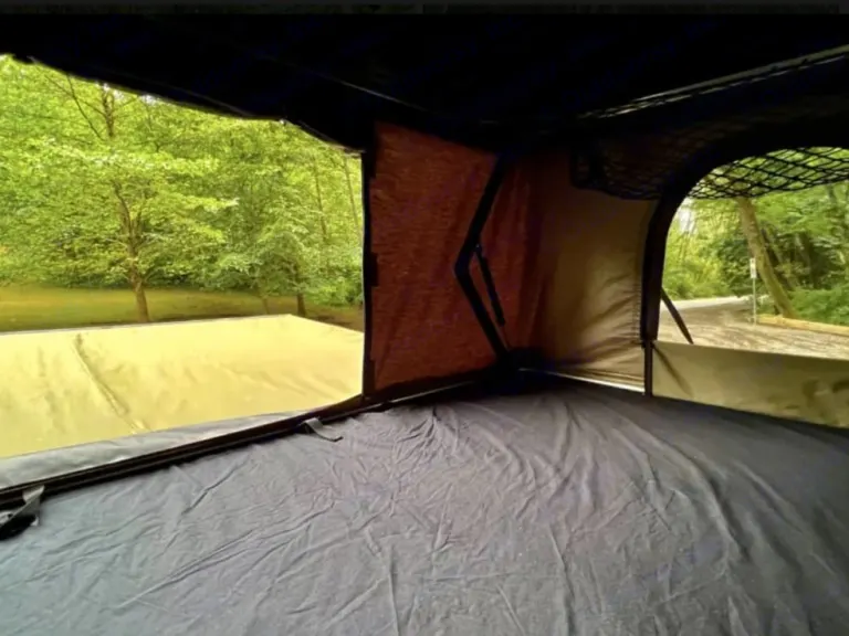 Cozy rooftop tent interior with dark bedding, mesh storage, and panoramic views of lush green trees, perfect for an RV rental adventure.. Dodge B Van 2008