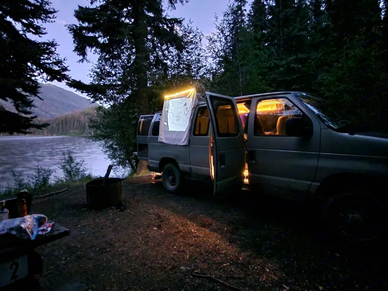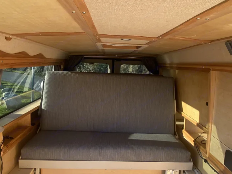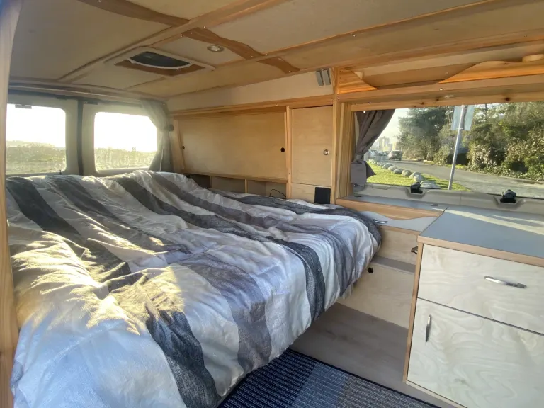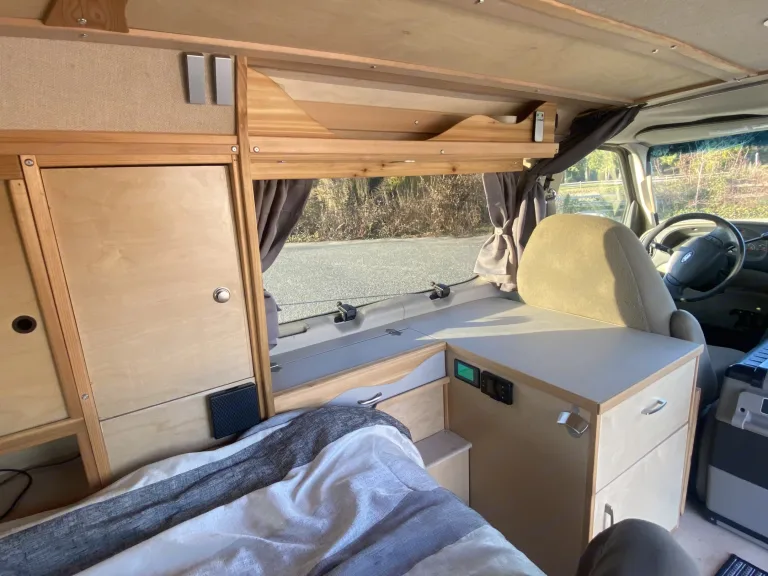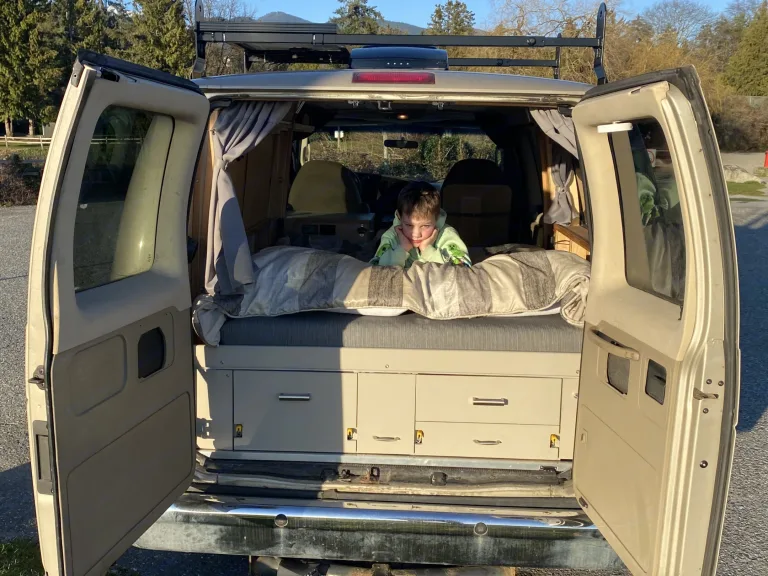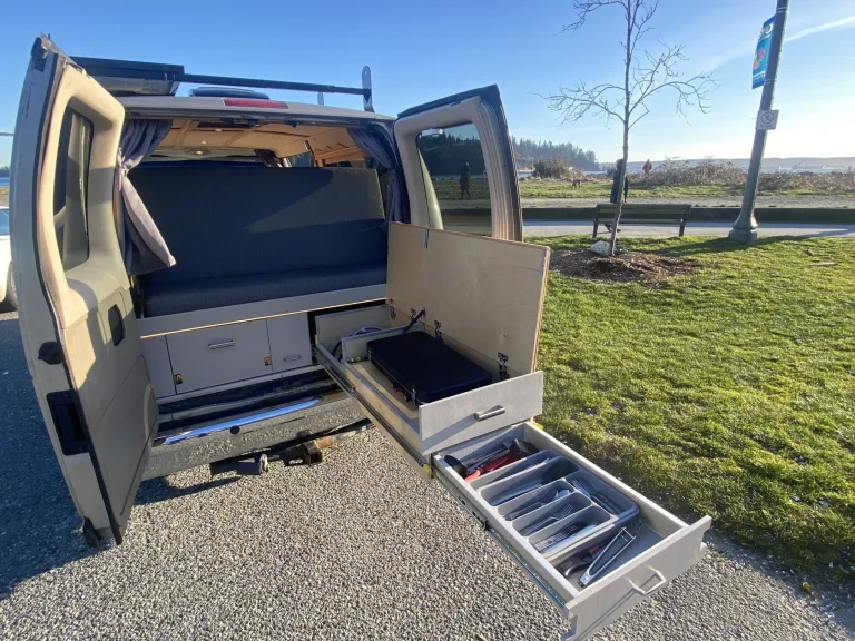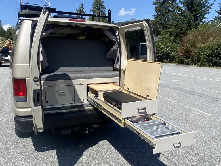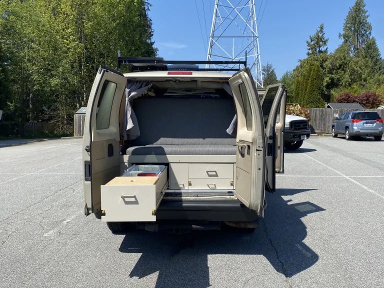 This van camper conversion has been lovingly crafted to provide a comfortable, cozy and convenient camp experience for one or two adults .Perfect for a romantic weekend, sightseeing or travel adventure in western Canada.The van has lots of interior storage, a bed that effortlessly converts into a comfy couch, a pull out cooking setup at the rear, a diesel heater to keep the van warm and cozy on chilly nights, a ceiling fan and several opening windows for great ventilation. There is a Lagun style table for playing card games, enjoying a snack, or working. The van is insulated, has a well designed electrical system with safe lithium 200aH battery, interior lights and chargers for devices. The battery is charged by solar and an alternator charging solution.The fridge is a chest style 12v fridge with plenty of room for food and drinks.The engine runs strong and has been well maintained.Lots of beautiful wood, including birch. Cedar and hemlock.What's included• fridge