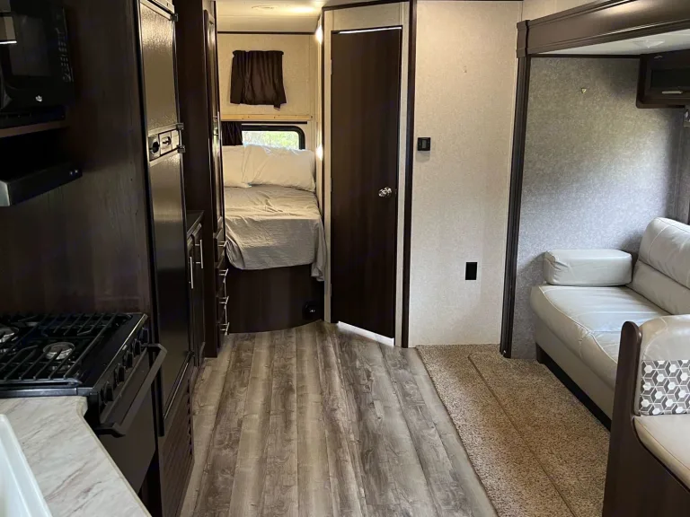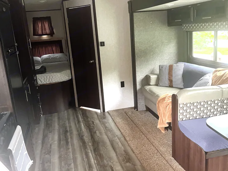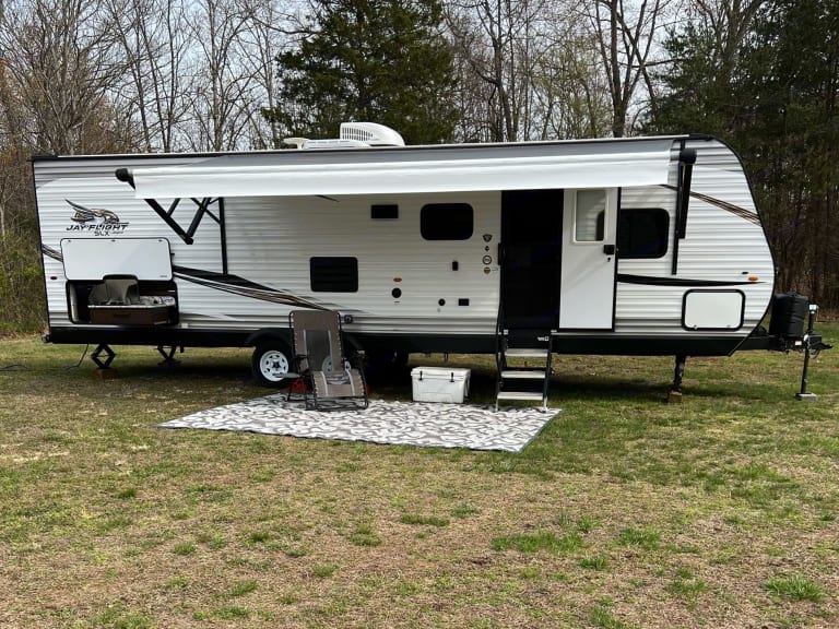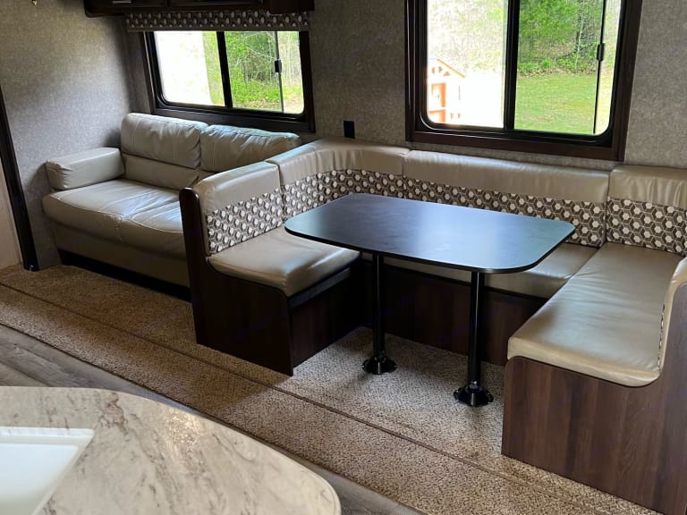 J-Bird is a 2019 Jayco Flight SLX. We are still putting our touch on it so more pictures and updates are to come but as you can tell not a lot has to be done since it is in great shape and ready to roll out for your next adventure.As of right now this camper can sleep 7-8 comfortably. There is a memory foam queen mattress in the master bedroom, large dinette that makes into a bed, sofa folds into a bed and a full memory foam mattress in the back. It has a big entertainment center with a satellite antenna, if you have a Roku and have wifi at the campsite you can hook that up. The bathroom is what sold us on this rig. It is Huge!! There is plenty of room to shower without hitting the walls at every turn.