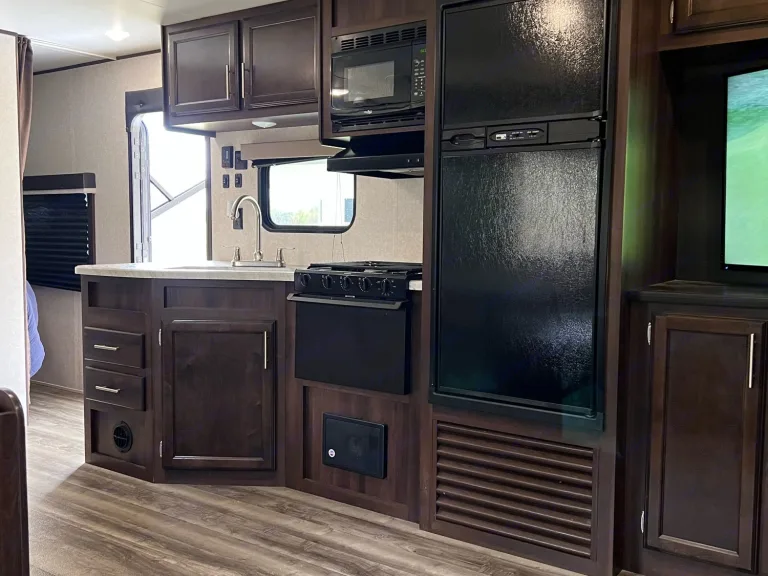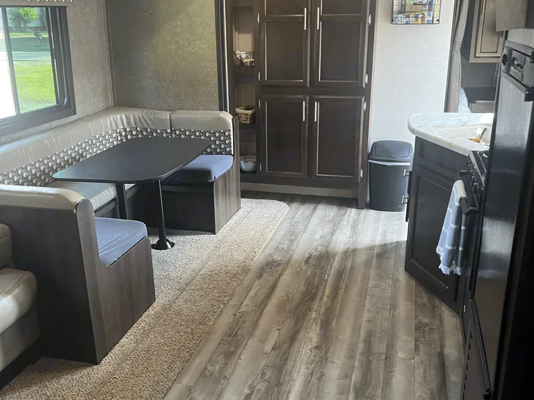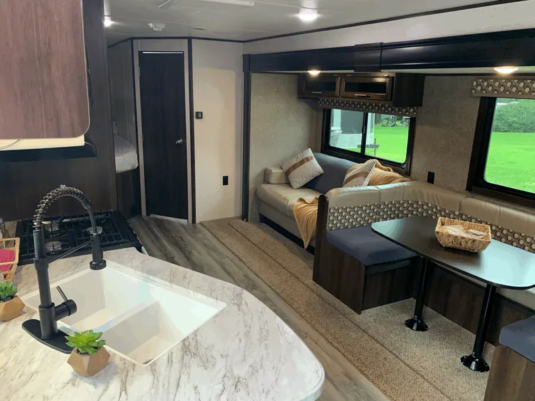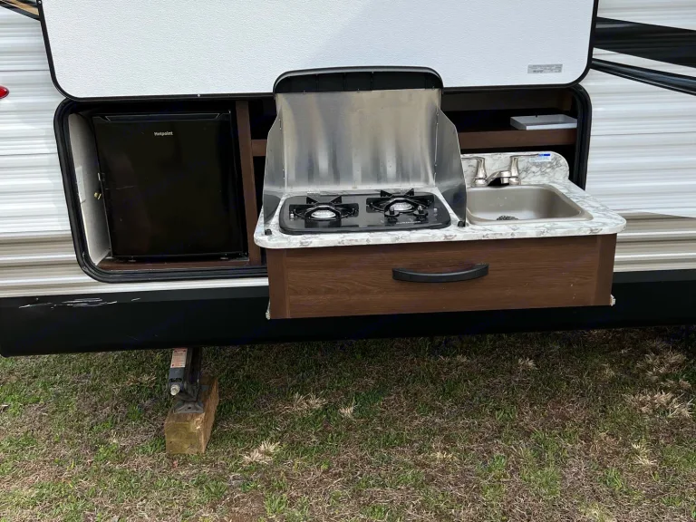 The kitchen has a sink, fridge with freezer and a gas stove and oven. It is stocked with anything you will need all you have to do is bring food.LED light strip under the awning makes for perfect outdoor relaxation. The outdoor kitchen has a small mini fridge and gas stove top. This thing is ready for your next camping trip or festival. It will come with a brand new 9x12ft outdoor rug and 2 camping chairs. Bluetooth radio with surround sound so you don't miss anything if you are inside or outside.We can't wait to share this amazing camper with everyone and all their adventures.What's included-Gas stove & oven