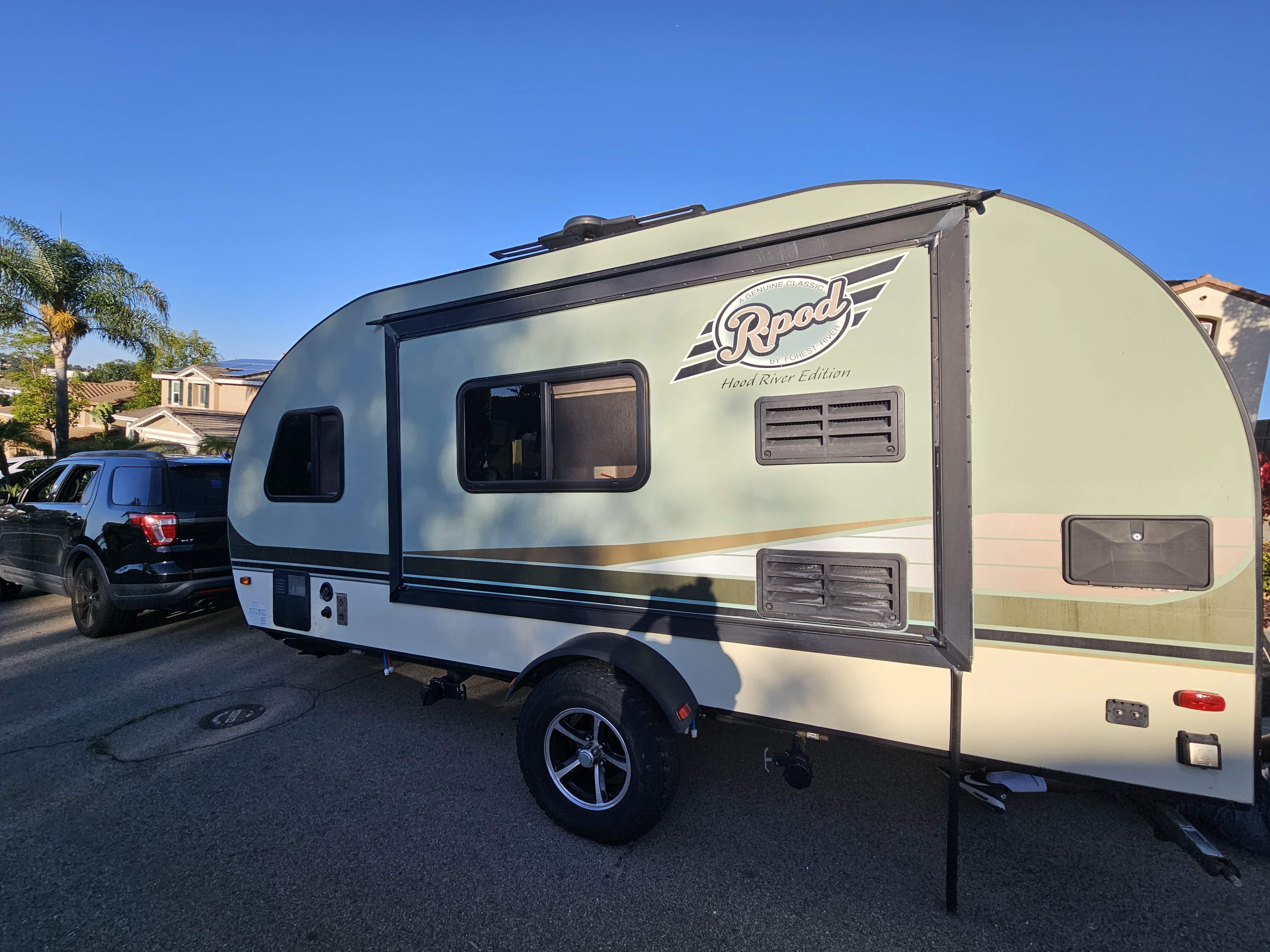 Cute little trailer that sleeps three but is most comfortable for two. Easy to haul (we use our Explorer). Has a super comfy queen bed (we changed the mattress out two years ago). Great for a weekend or a long haul. Delivery available within 30 miles of 92056.What's includedFresh linens on queen bed