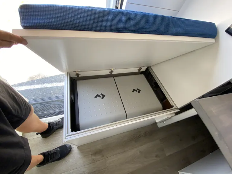 POWER: Random buttons and procedures were kept to a minimum. Simply plug in your phone charger or the included induction cooktop. The battery power is easy to keep track of on the state-of-the-art touch screen control panel, or via the app remotely, but don’t worry, the vehicle can run the lights, fans, fridge, and charge whatever you need and still get topped off daily by the onboard solar panels automatically. No need for a noisy generator.