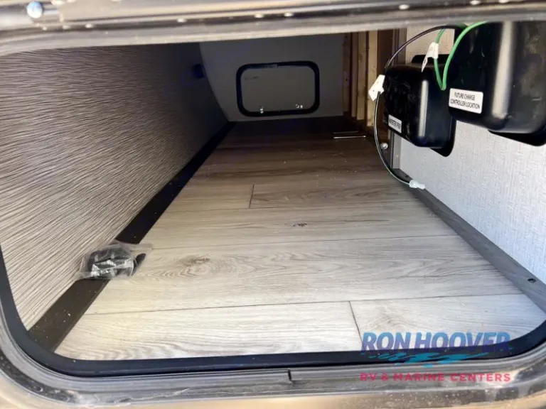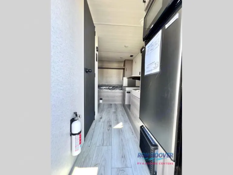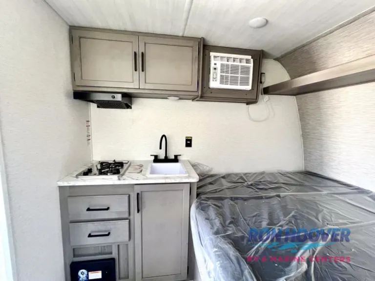 RV rental: Compact interior view with bed (protected by plastic), sink, AC, and overhead cabinets.. Keystone RV Hideout Sport 2025