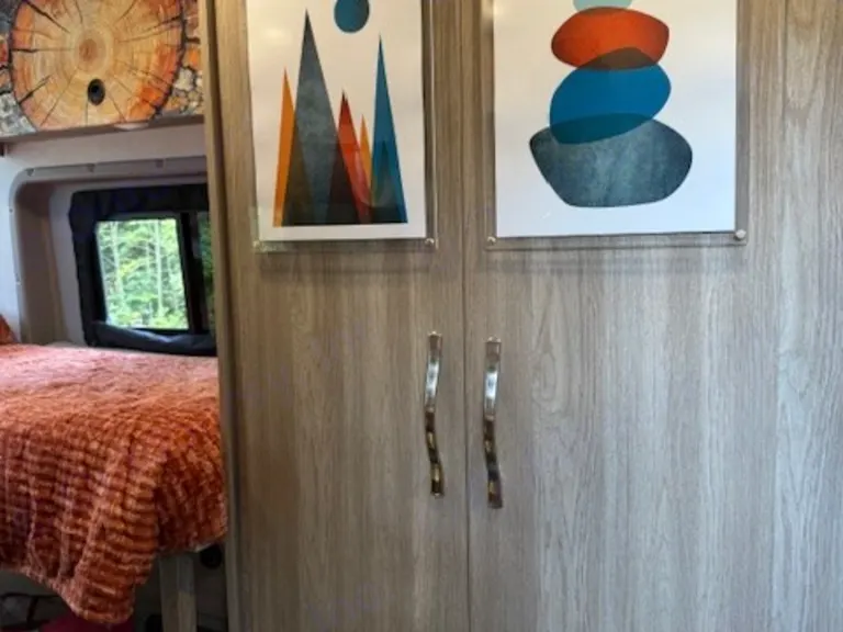 Wanda the Wandervan, a 2025 Winnebago Solis 59PX, is unique! Wanda offers a variety of sleeping options usually not found in a 21 ft. camper van. Twin beds? Queen bed? Single bed with a workstation? A double bed or two large sleeping bags (custom made with sheets, cotton fleece blanket, and a quilt) in the pop-top? Wanda seats four and sleeps four - so you choose which accommodation suits you, and we will have comfy bed linens and pillows waiting for you!From the outside, Wanda may look like a basic white camper van with a pop-top – but wait until you step inside! You will be greeted by Yosemite’s Half Dome on the refrigerator door, then an interior filled with artwork from nature and a teal and terracotta color palette.Custom touches abound! A handmade curtain offers privacy, light reduction, and helps control temperature in the van. French bathroom doors replace the awkward bi-fold door. Decorative “tiles” on the enlarged 30" dining table, and its optional 30" extension table, match the backsplash. Wall-to-wall rugs carpet the floor.You will be impressed with the comfort and ease of traveling and camping in Wanda! Come enjoy the daily activities of van and camp life, the coziness inside during a major thunderstorm, the relief from mosquitos the bug screens provide, the coolness of the fans and air conditioner when temperatures are hot outside, and the privacy at nighttime. Wanda is easy to drive and park! Wonderful trips and memories await you!We provide a detailed orientation and Renter's Manual to familiarize you with the Wanda's workings so your trip goes smoothly, So, whether you choose to head to the beach or the mountains, know you will go there in style and comfort. Wanda the Wandervan is truly unique! We are eager for you to meet her!