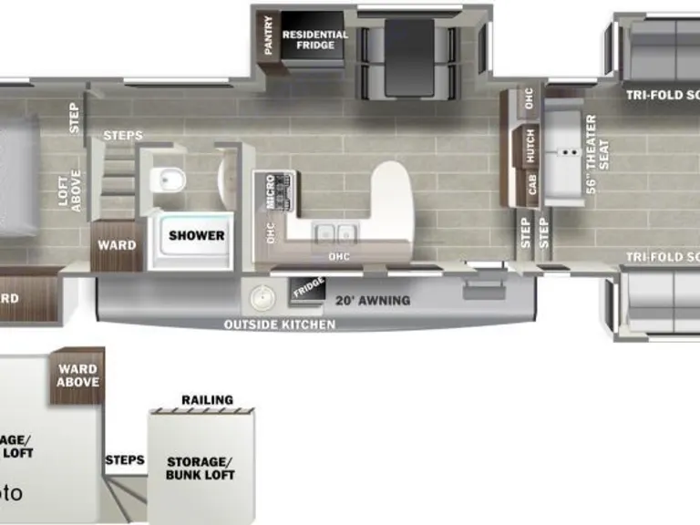 Worried about being cramped? Don't be. The ceiling in the kitchen/dining area is 8', nearly 6'6" in the living room, with plenty of head space in the shower. Enjoy the full living room with 3 sofas including two with heat and massage functions, gas fireplace, and big screen tv. The loft also has its own tv and is a great space for kids or storage.