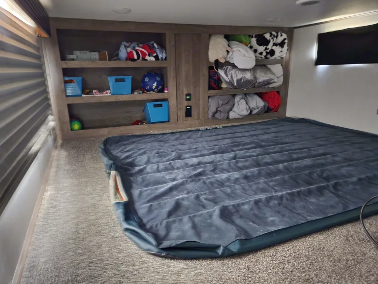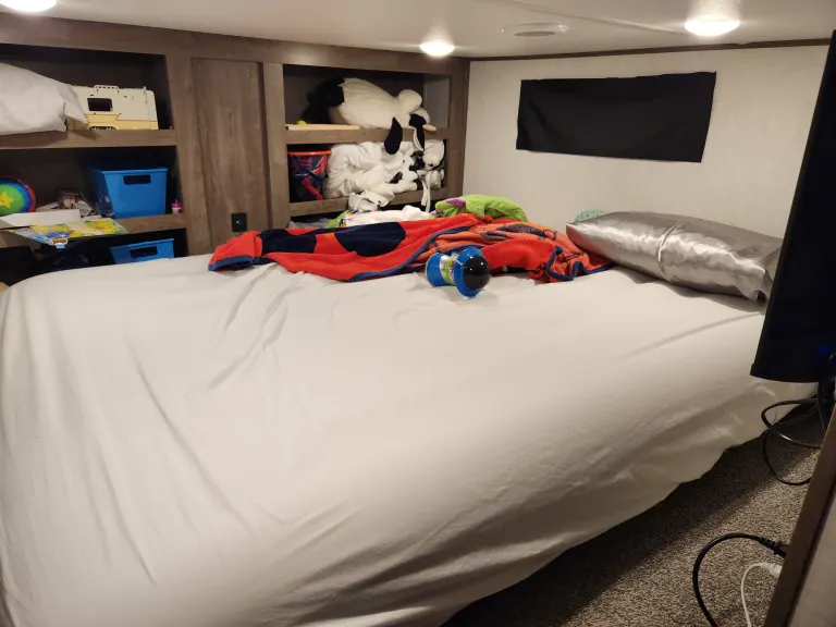 Glamping at its finest. This 42-foot fifth wheel can sleep at least 8 guests comfortable. There is a king size bed in the bedroom, a full-size inflatable mattress in the loft, and the fold out couches in the living room can each hold at least two people.