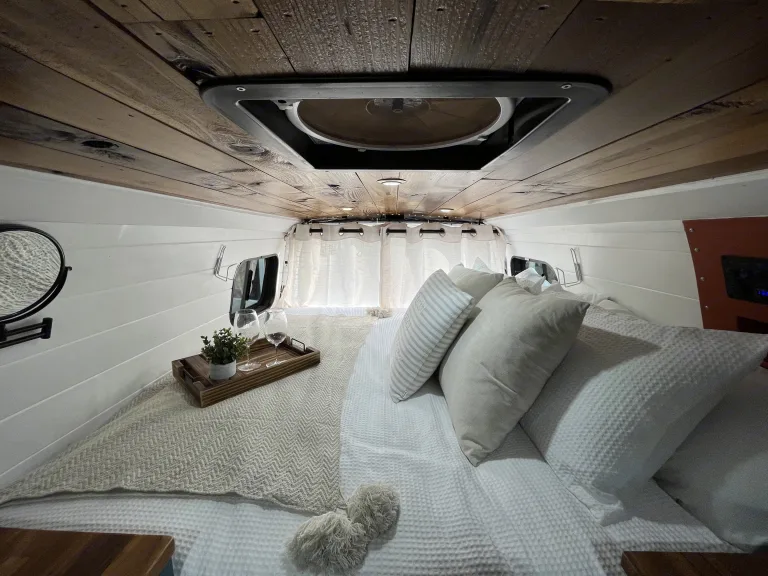 With 2100w energy solar panels charging 2125 amp deep cell marine batteries, the van is fueled by natural energy for the interior lights, water pump, USB chargers, fan, and the 12v 50L Fridge. There is also a 1500w inverter that can connect to shore power, but it can also be connected to power the outlets inside the van. This loaded, air conditioned rig has a mounted 8x8' Doghouse Awning and is equipped with a new Boss audio double din head system with Apple/Android audio, Bluetooth audio streaming, a backup camera, and door kicker speakers. Did we mentioned the Queen/King Size bed? Well, it is plenty of room for a great nights sleep for two, plus your furry little friend ;) Lots of extra storage inside for all your clothing, food, and gear! Plus, a roof bin for the long, awesome journey's!Your journey awaits you with all the amenities you can dream of ready to go!Mileage allowance is 500 miles (800km) per day - approx. 8hrs of free driving per day :)See additional amenities listed below.