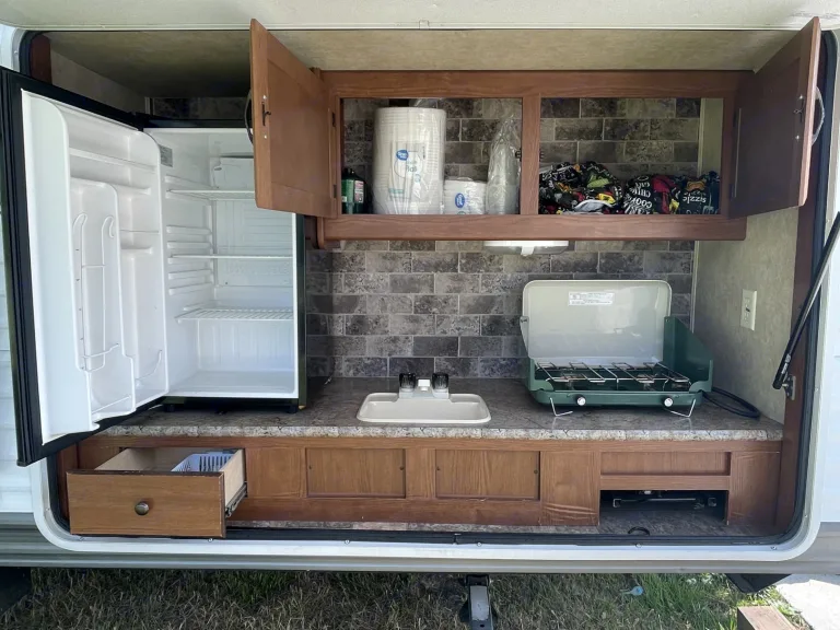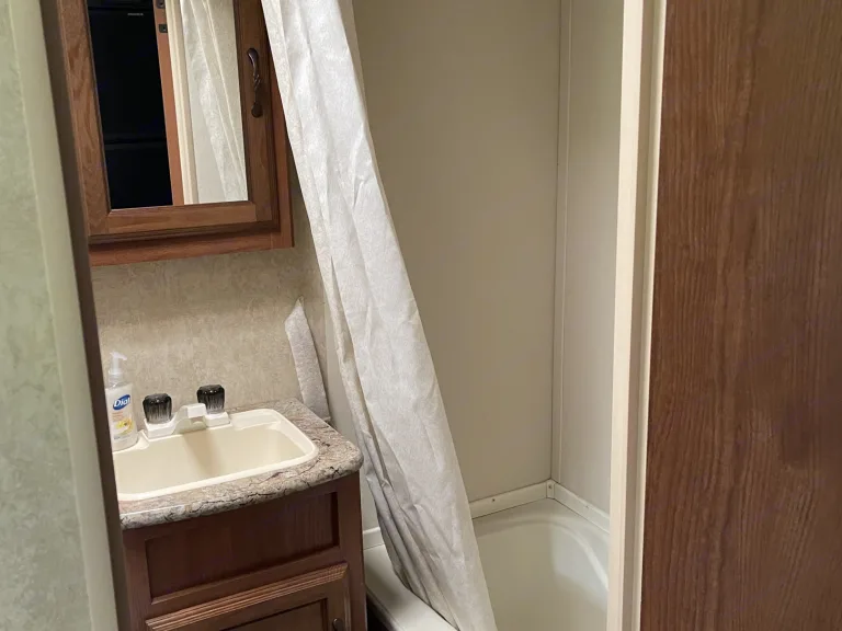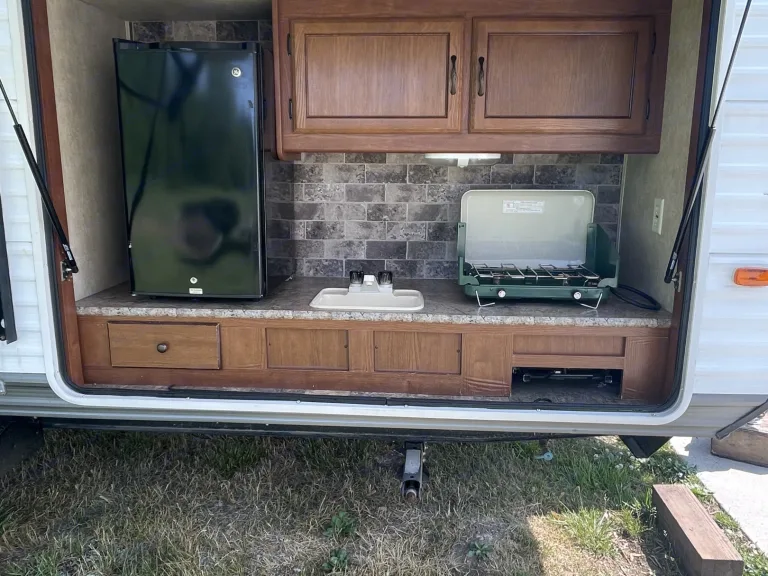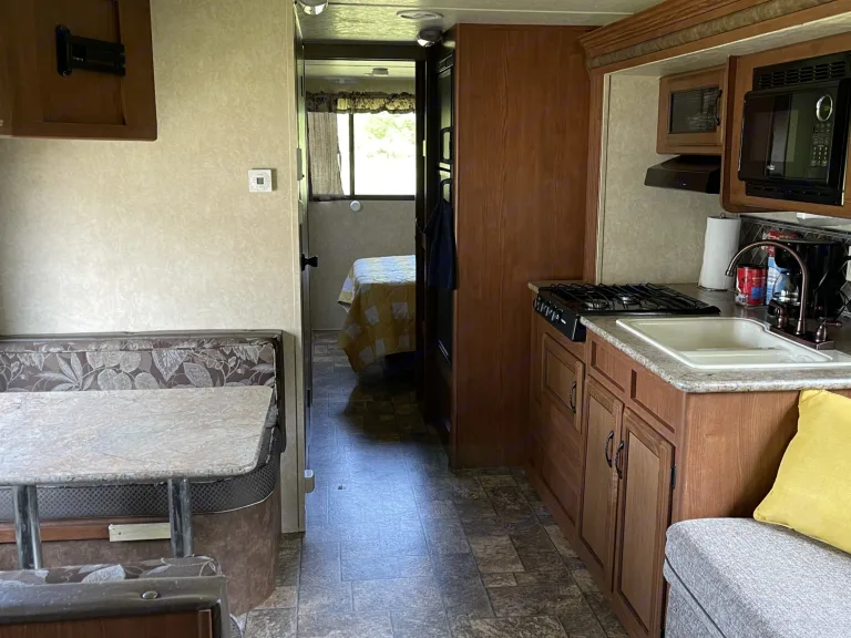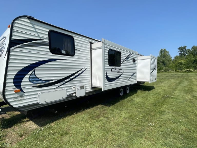 The unit will be cleaned thoroughly after each rental, including bedding, towels, and all surfaces. This includes a durable RV toilet not one of the cheap plastic ones.The trailer has an electric tongue jack and will come with an impact driver socket for the stabilizer jacks. The awning is super easy and simple to pull out and retract. This speeds up the setup and tear-down times tremendously.This trailer includes 400 watts of solar to keep the batteries topped off and includes an inverter to keep things like the refrigerators running while traveling. Even the A/C can be run for about an hour before the batteries deplete while traveling so that it is already cool when you reach your destination. The solar power is not enough to go camping off the grid but just offers the luxury of running things while traveling or for other temporary moments when not connected to power.Supplied in the trailer are plates, bowls, cups, cooking pots and pans, serving bowls, cooking/eating utensils, coffee pot, coffee cups, marshmallow roasting sticks, grill tools, cleaning products, towels, picnic table cover, hangers, board games, outdoor camp stove, outdoor rug, and disposable dishes/utensils.The trailer has a bunkhouse with 3 beds to sleep three people in the same room. The couch folds down to sleep 2. The table breaks down to sleep 2.This unit has two slideouts which offer a lot more room in the kitchen/living area and allow for a spacious master bedroom with a closet.This unit has two refrigerators, one of which can be run on propane or electricity. This allows for a lot of storage for food for those longer camping trips. The electric-only refrigerator is in the outdoor kitchen which includes outdoor cupboard space for easy access to snacks and a sink with its own designated holding tank.Unless you are getting it delivered, you must have a brake controller installed on your vehicle. What's included- Cooking utensils
