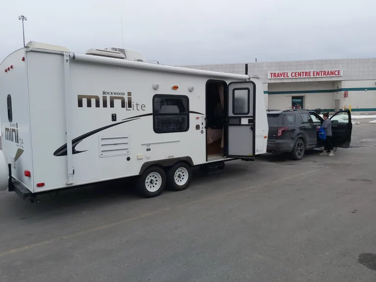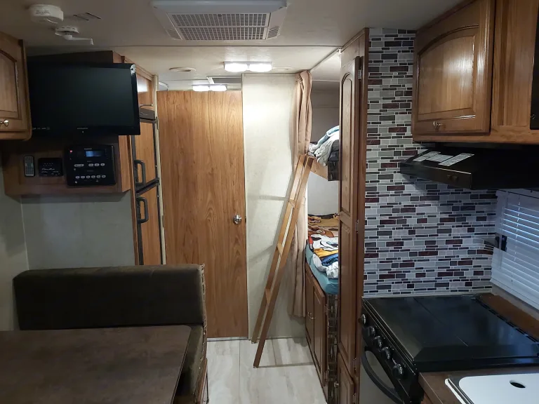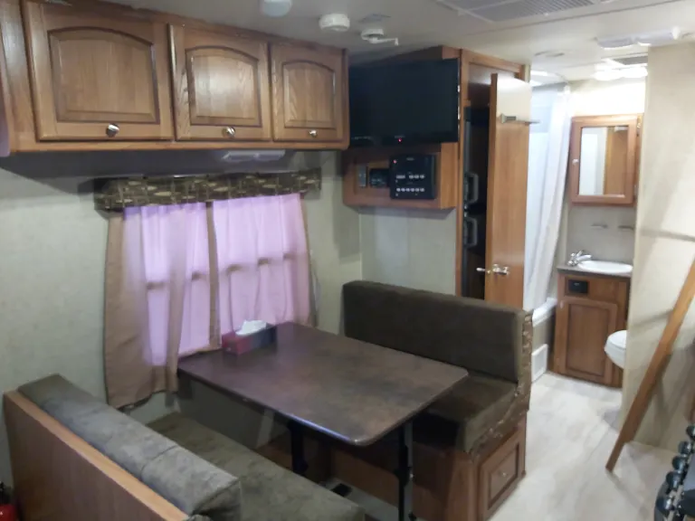 Our family camper is 23 feet and can sleep up to 6 people. It is designed for easy towing and is ideal for those who want to enjoy the RV lifestyle without the need for a large and bulky RV. One of the main features of our camper is the lightweight design(constructed with fibreglass exteriors and aluminum framing), making it easy to tow with SUVs. This model also comes with a kitchen dinette that converts into a full bed, a heated double bed with privacy curtain and 2 bunk beds which are great for families with kids.