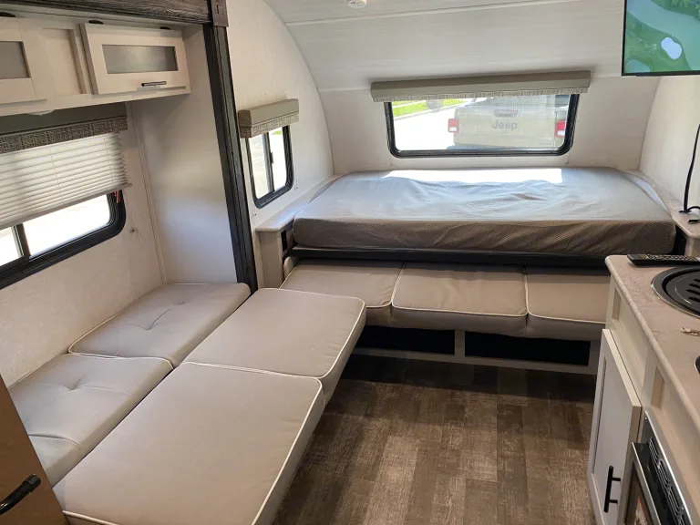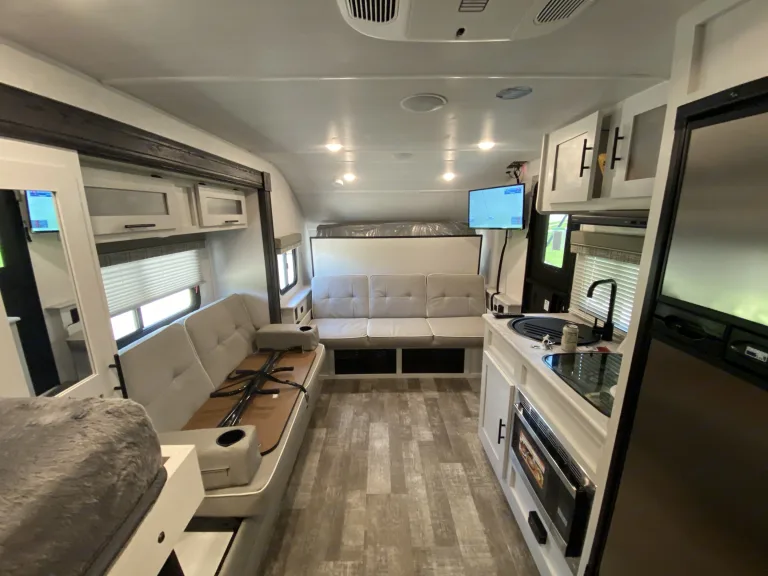 The R-Pod is a 23 footer with one slide out. Has a queen Murphy bed, fold out sofa, and 2 bunk beds. Includes a TV with FireStick to stream your favorite shows. (No internet connection. User would have to use their own hotspot.) microwave and 2 burner stove.It also has an outdoor grill hookup. So you can do some grilling outside and listen to some tunes while hanging out.Includes a water heating system and bathroom contains a small shower.What's includedFresh linens