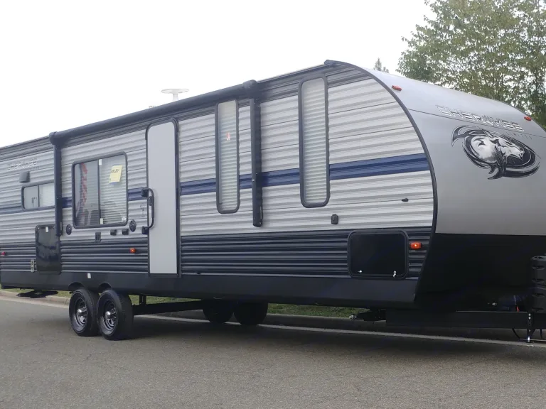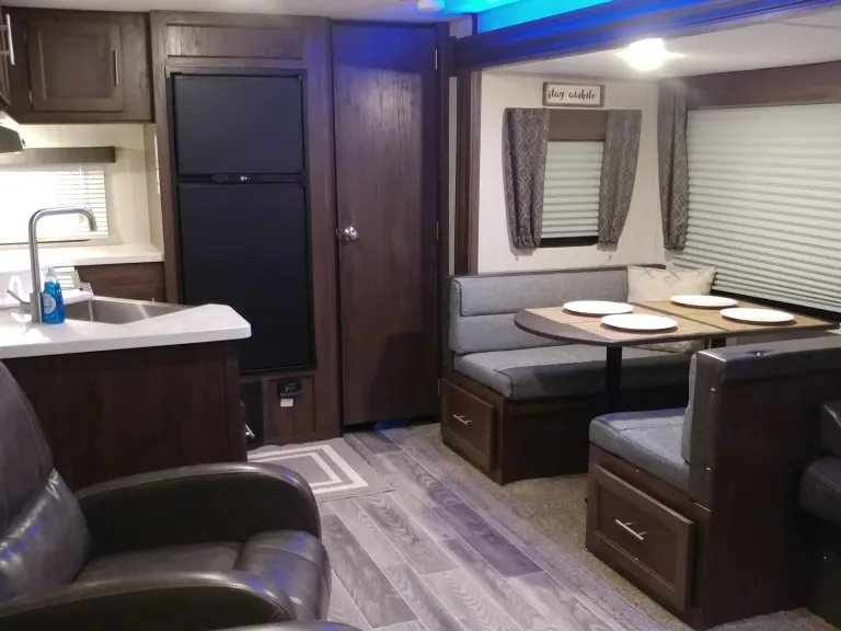 Beautiful travel trailer. Couch in living room folds down to make a comfy bed. Two nice recliners that are perfect for relaxing. Want to watch tv outside just bring the t.v. from inside and place it outside on trailer to enjoy. Blue led lights on awning and in living room. Nice colorful fireplace for added relaxation. Small fridge and ice maker outside. Indoor/outdoor speakers for the radio.
