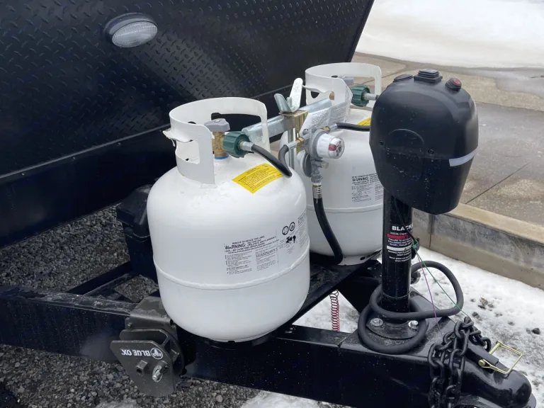 Empty grey tank first until the control panel in the trailer shows empty. Then empty the black tank until the control panel shows empty. If the black tank isn’t emptied completely use hose to flush the tank. It’s located on the outside of the trailer above the grey and black tanks.