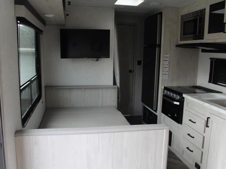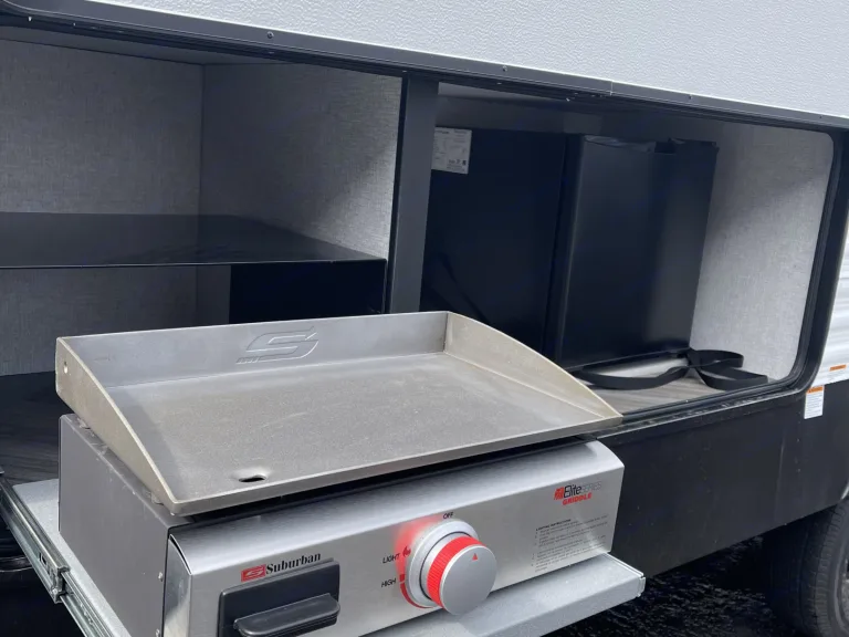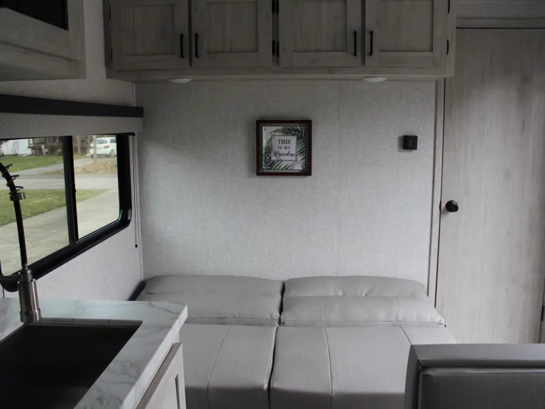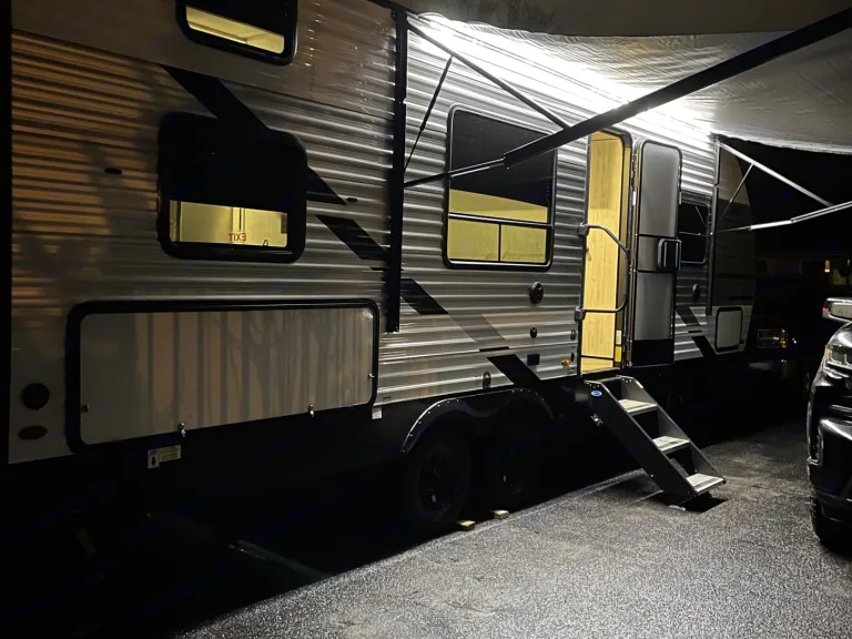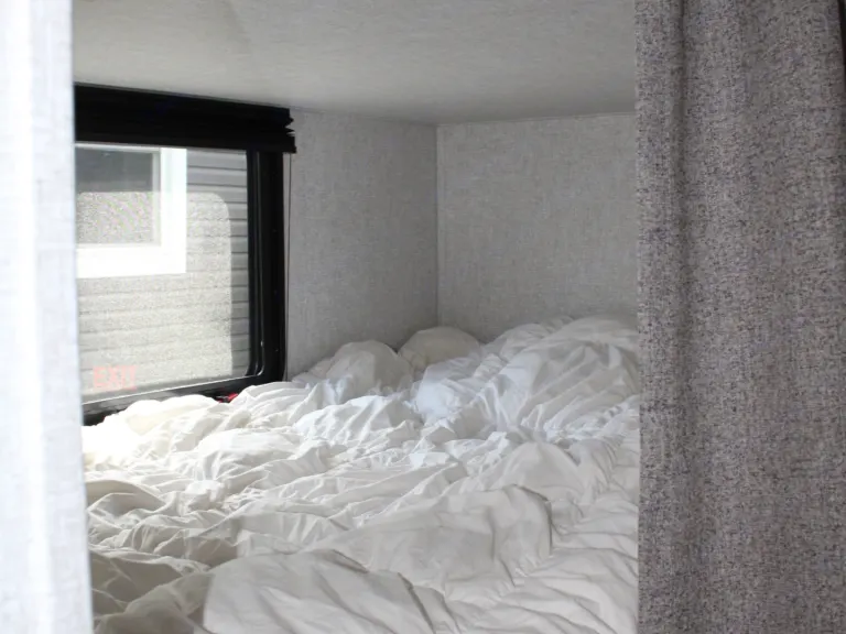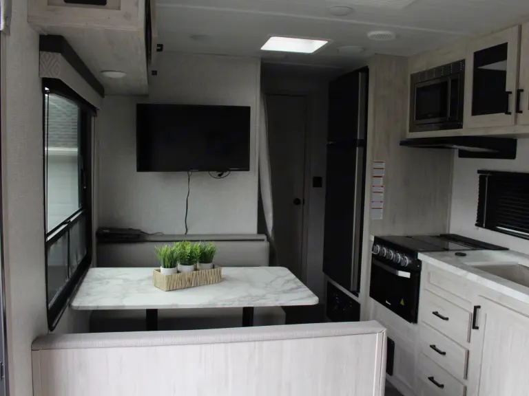 Our home away from home is equipped with all you need for your next camping adventure! This trailer has a TV with antennae, USB charging stations in bedrooms, 2 zone sound system with Bluetooth and Hdmi compatibility. The trailer has a spacious dinette and couch that converts to double beds along with a king size bed and bunk beds. Enjoy our outdoor grill and bar fridge for easy access when outdoors. The trailer has a residential fridge/ freezer and three burner range stove with oven and extra large sink. There is plenty of storage for personal belongings as well as games, books and movies for your enjoyment. Outdoor shower with hot and cold as well as a large shower inside. The trailer has air conditioning, heat, and hot water tank. Comes with power awning with LED lights. Easy to set up and take down, just pull into your site and start your camping adventure! What's includedPots and pans