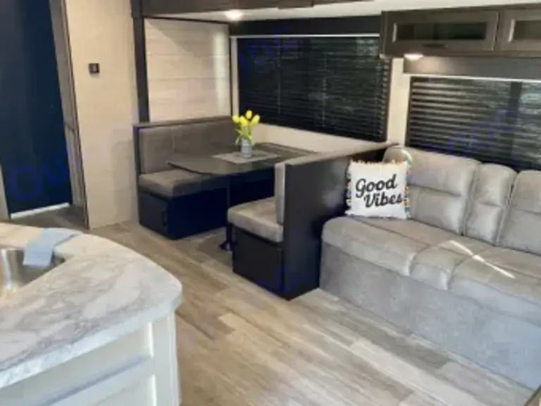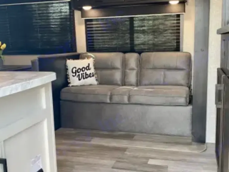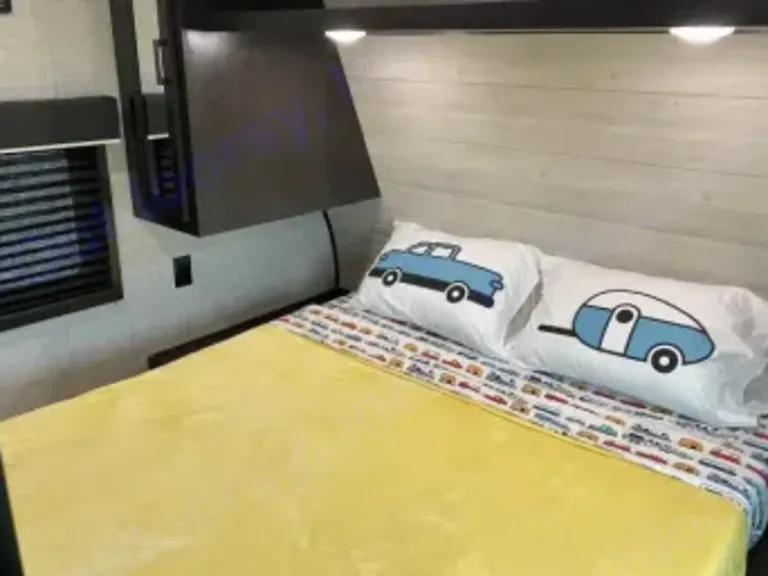 Our brand new camper has a Queen size bed in a private bedroom for mom & dad and 2 Full size bunks for the kids! The dinette and couch also fold out for extra friends. The slide out in the living area provides plenty of space for everyone to be comfortable. The bathtub (or outdoor shower!) is perfect for bathing little ones and the outdoor kitchen is great for making cocktails under the stars.What's included- Air Conditioner and Heater