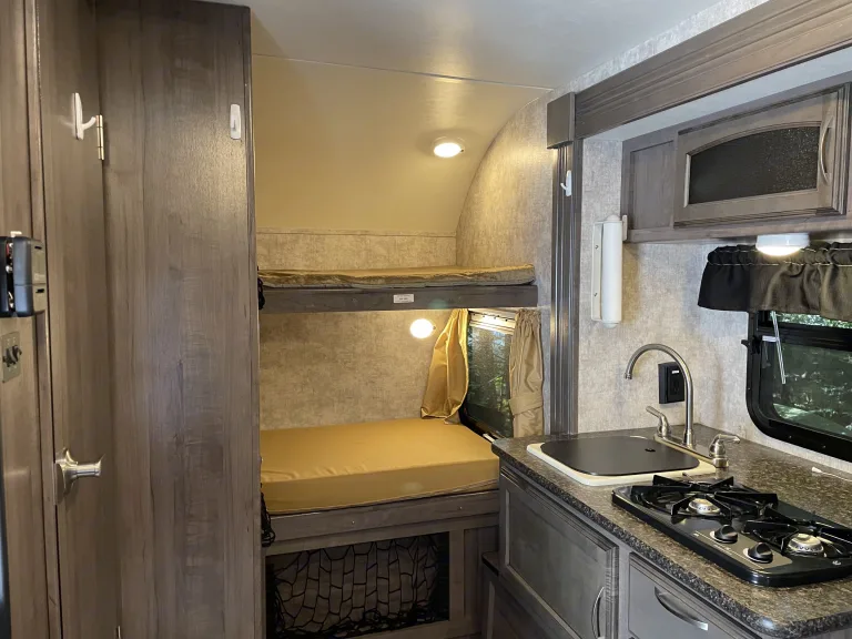 Looking to create lasting memories with your family? This Winnie Drop 170K is the perfect travel trailer for you! With its cherry exterior, this trailer is sure to turn heads wherever you go. It has a compact design and is easy to tow, with a dry weight of 2,760 lbs and a Gvwr of 3,500 lbs.Inside, you'll find a cozy and functional interior that sleeps up to 4 people. The main living area features two twin size bunks, great for kids or two friends traveling together. There's also a dinette that converts into a bed, so the trailer can accommodate a small family as well. The fully equipped kitchen has a sink, refrigerator, microwave, and two-burner stove. Plus, the trailer has an outdoor kitchen with a small fridge, expanding your living space and helping you to enjoy the outdoors even more.The bathroom is a wet bathroom, with a shower, toilet, and sink all in one compact space. It's perfect for quick and easy clean-ups after a day of adventures. There's also an outdoor shower for even more convenience. The trailer has a 31 gallon fresh water tank, a 25 gallon gray water tank, and a 25 gallon black water tank.This trailer is loaded with features and amenities to make your trip more enjoyable, including an 8ft awning, outdoor speakers, and a TV with DVD player. It also has air conditioning and heating to keep you comfortable in any weather. The trailer has a power retractable slideout.This travel trailer is located in the beautiful Monadnock Region of New Hampshire, where you'll find endless opportunities for outdoor fun. So why wait? Pack your bags and hit the road with the Winnie Drop 170K. It's the perfect travel trailer for creating lasting memories with your family!Sleeps up to 4 people