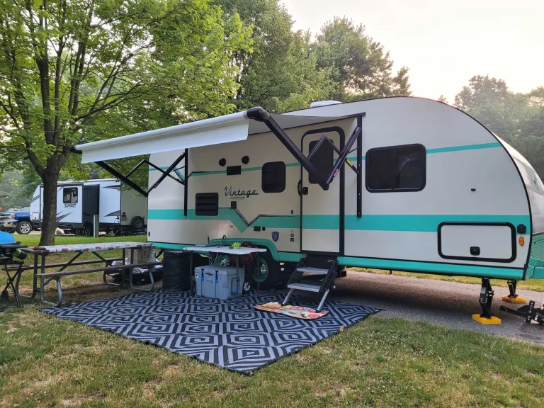 Retro Vibes with Modern Comfort – 2022 Gulf Stream Vintage Cruiser 23QBSStep back in time with our charming Gulf Stream Vintage Cruiser 23QBS, where classic 1950s style meets all the modern comforts you need for the perfect getaway. This lightweight, easy-to-tow travel trailer is ideal for couples or families looking to hit the road in style.Sleeps up to 6 comfortably with a cozy queen bed, a convertible dinette, and twin bunk beds—perfect for kids or extra guests. The interior features retro turquoise upholstery, vintage-look cabinetry, and fun details that make every trip feel special.Whether you're exploring national parks, hitting a local campground, or tailgating in style, our Vintage Cruiser makes every trip memorable.Book your retro escape today and let the good times roll!What's included• pop up shade tent included