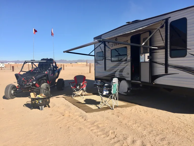 new 21 ft toy hauler that will fit full size side by side ( rzr,yamaha, artic cat) as well as quads, dirt bikes or full dress motorcycle. Outfitted with a electric drop down queen bed in the rear along with a fold down sofa and upfront a private bedroom with a queen pillow top bed. Nice kitchen with double sink, 3 burner stove and oven, microwave and fridge. A/C for the hot days and furnace for the cool evenings. The bathroom is quit large with a shower, sink and of course a toilet. This toy hauler is great for dry camping and holds 100 gallons of fresh water, 50 gallons of grey and 50 gallons of black water. comes with a tv and dvd player as well as a radio with audio input. Electric tongue jack for easy hook up and jacks on all corners. Has 2 - 12 gallon propane bottles for no worries of running out of propane when heating, cooking and washing. The electric awning is great for sitting out side in the shade or for family grilling and fun times. RV can be used as just a camper or for toy hauling.Towing within state lines and California only