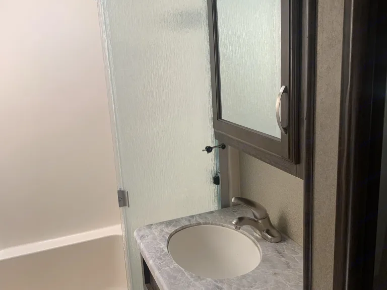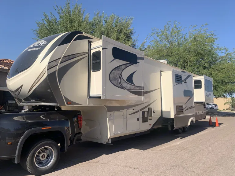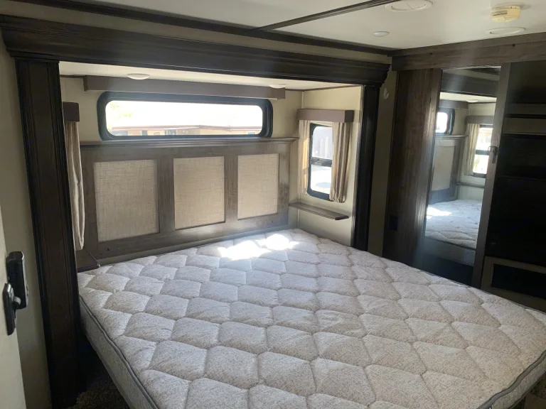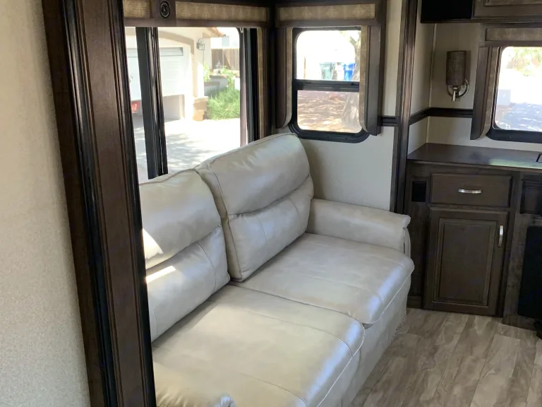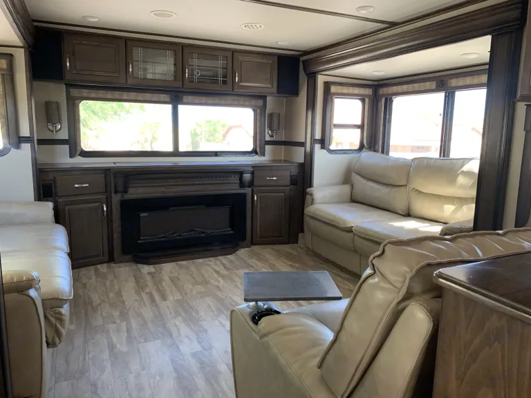 This is a beautiful and luxurious 5th wheel by Grand Design. Top of the line with all the amenities that you need. This spacious 5th wheel will sleep 6 people comfortably. With dual pull out couches in the living room and king bed in the master bed room, everyone will get a good night sleep. This trailer has dual 15,000BTU air conditioners to keep you cool during the summer along with a 35,000BTU furnace to keep you warm during the winter. Also has a beautiful electric fireplace in the living room for added comfort. Kitchen is decked out with microwave, gas cooktop, oven, large sink, pantry, large fridge & freezer which will be cold upon your arrival. This trailer comes with everything you need to stay in it including linens, towels, toilet paper, kitchenware, etc. We know how important it is to have your furry family on your camping trip so this trailer is pet friendly.Features: