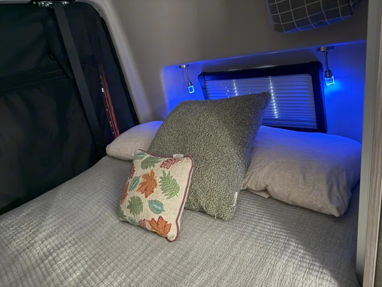 You’ll sleep soundly thanks to the extra foam mattress topper, and if you’re working remotely, the van has the option of being equipped with a mobile-friendly workspace. Since I rely on high-speed internet for work, I seek out locations with reliable Verizon mobile WiFi — happy to share tips if you're interested!