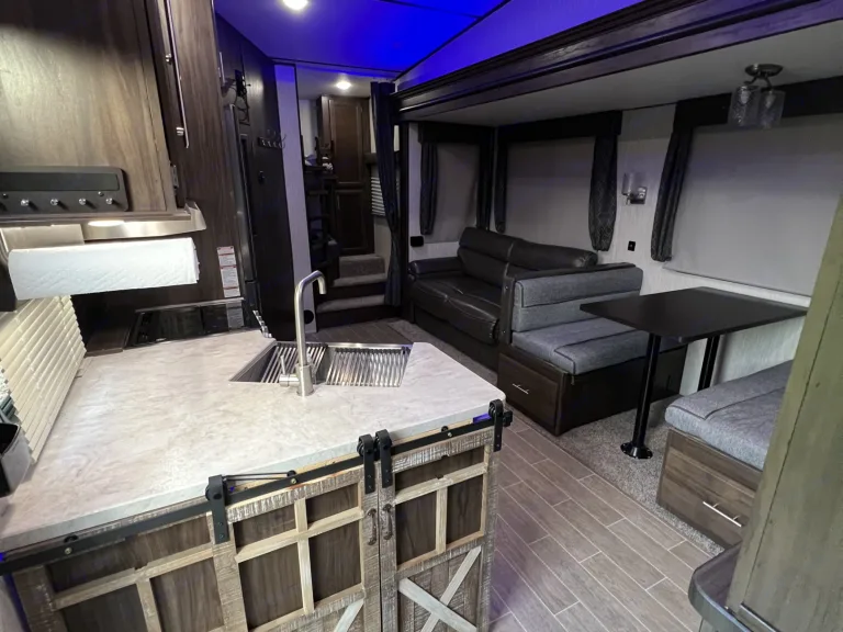 2020 Forest River Cherokee Arctic Wolf Camper for rent. This camper sleeps 6-8 people. Queen bed in master bedroom with plenty of closet storage. There is a pull out sofa that will sleep 2 comfortably. There is also a bunk bed nook that can comfortably sleep one adult or 2 children. The table does NOT make a bed. The bathroom has a roomy stand up shower with doors. Built in Bluetooth radio with indoor and outdoor speakers. Automatic awning outside with LED lights. Two air conditioners/heaters and ceiling fan. The trailer has farmhouse style accents/decorations. Large walk in pantry. Small propane grill and outdoor chairs included. Feel right at home while enjoying yourself!What's includedFresh linens and towels, Small propane grill, Outdoor Chairs.Other things to noteNo smoking. No Pets.
