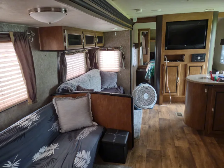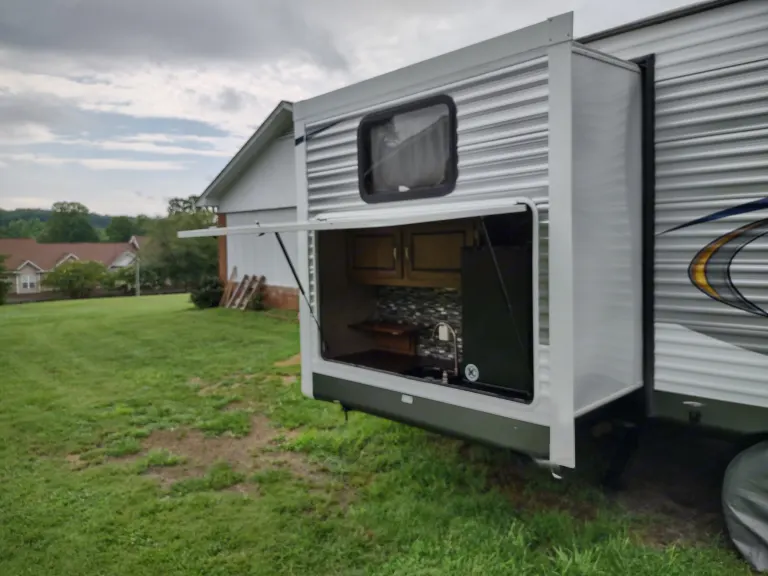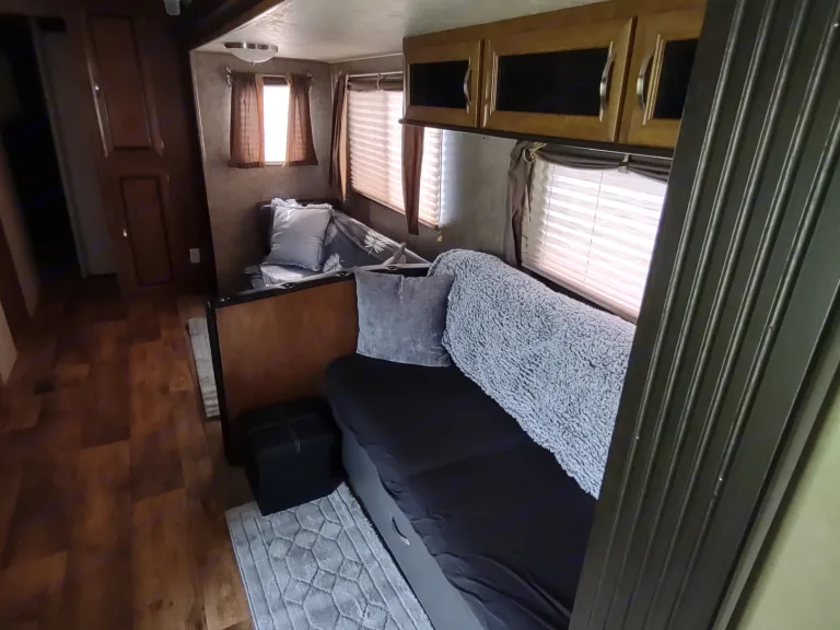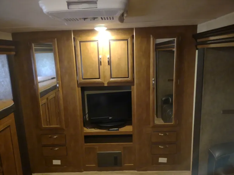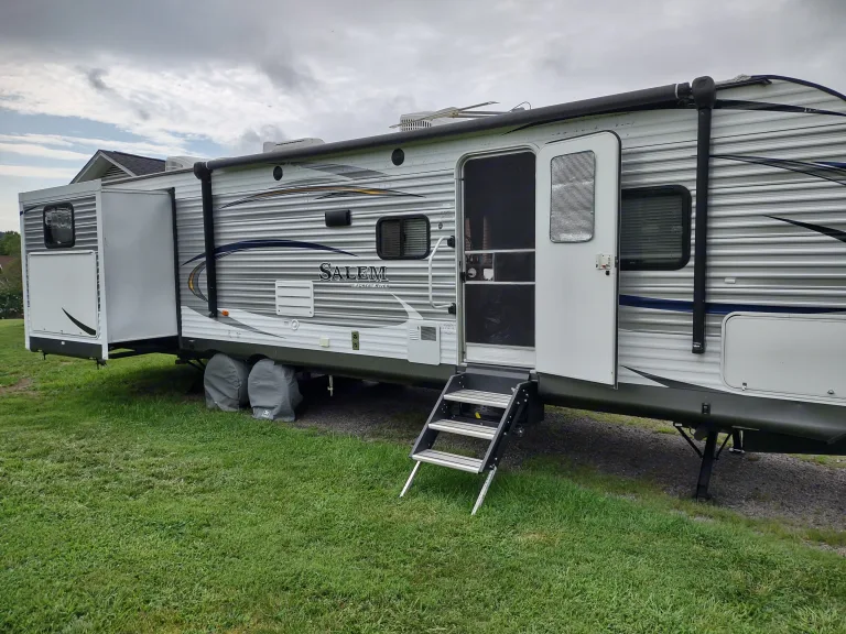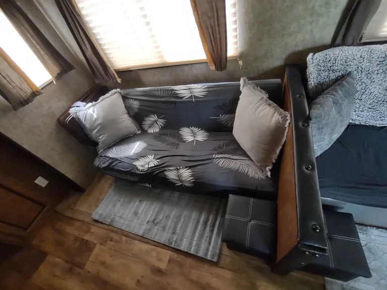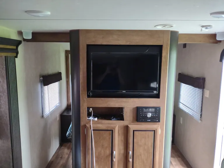 This camper is Huge! At a total length of 36 feet, you have room for the family. This camper includes all the amenities that you would expect to have and more; 3 slides, electric awning with awning lights, electric tongue and stabilizing jacks (all remote controlled), 3 TV's, 2 roof AC units, digital climate control system, ducted furnace, dual 30 lb. propane tanks, 2 bunk beds, 3 sleeper sofas, queen master bed, refrigerator and freezer, microwave, full bath, Bluetooth stereo system with outdoor speakers, outdoor kitchen with refrigerator, and lots of storage space. This camper not only has all the amenities you want in a rental, but is beautiful as well.What's includedWe have included much of the simple necessities that you would use while camping; plastic cutlery, cups, plates, coffee maker, paper towels, trash bags, and propane.We ask that you supply all personal items such as towels, wash cloths, pillows, and bed linens. We take great care to sanitize the unit after each rental.Other things to noteThis camper is heavy. At over 8500 lbs. of dry weight, you will need a heavy duty truck to pull it (we recommend letting us pull it to your destination).This camper is a 50 amp unit. You will need to reiterate this with the campground when making reservations.