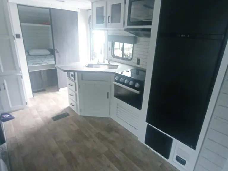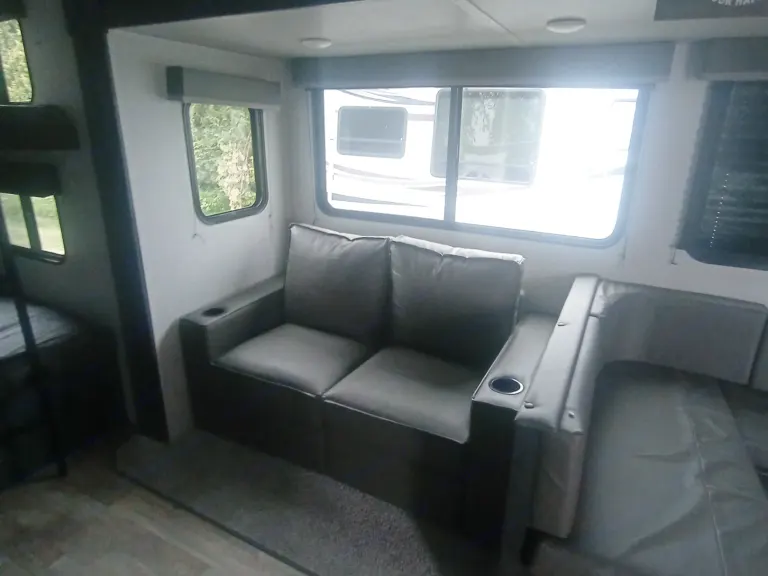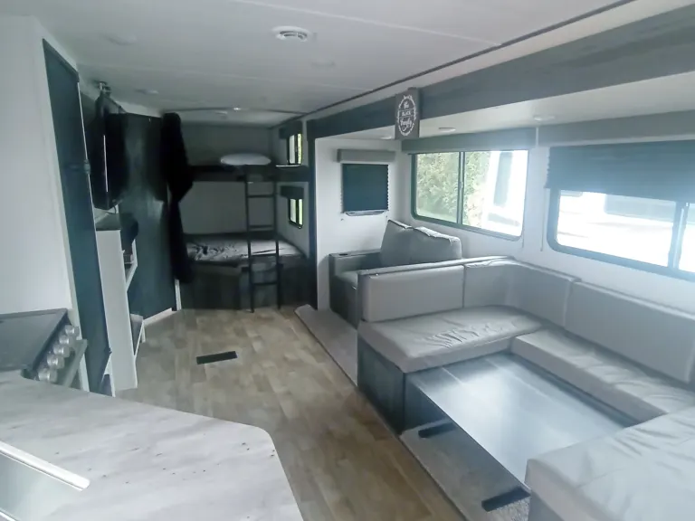 Welcome to The Roaming Retreat!Embark on your next adventure with our luxurious 32 ft 2022 Travel Trailer, where beauty meets functionality, and comfort meets convenience.Inside, you'll discover a haven of elegance with beautiful finishings that truly make it a home on wheels. Enjoy the comforts of home with a fully equipped kitchen boasting a gas oven and range, microwave, and an 8 cu ft fridge. Stay cozy by the gas fireplace while catching your favorite shows on the TV. Whether it's a warm day or chilly night, our A/C, and furnace ensure you're in your comfort zone. The hot water tank guarantees a soothing shower or bath in the spacious shower/tub combo.Families will love the bunk beds for the little adventurers, and the tri-fold couch easily transforms into an extra bed. The queen bed provides a firm yet restful sleep, and the u-shaped dinette converts into yet another cozy sleeping spot.But it's not just the inside that's a delight – step outside to discover an outdoor kitchen equipped with a gas range and a fridge. Freshen up with an outdoor shower after a day of exploration. Our trailer is designed for all your needs, featuring two entryways for convenience.Equipped for any journey, The Roaming Retreat comes with two propane tanks, a 60-gallon freshwater tank, a 78-gallon gray water tank, and a 38-gallon waste water tank. With full hook-up, enjoy the ambiance of the electric fireplace. Stay charged with ample electrical outlets, including USB ports.Here is a manufacturer video of our model: https://youtu.be/n8z0wgGA2DA*Please note we do not offer refunds on early returns. What's included• Plastic cups