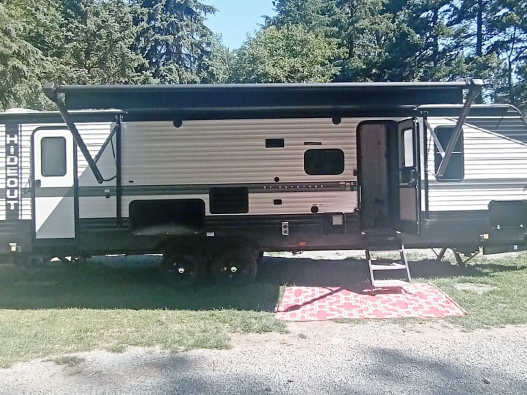 require a minimum three (3) night rental.3. Bookings on private residential property or campgrounds not open to the general public are not permitted.4. We do not allow renters to tow. You book the site and we deliver and set up the trailer. Please ensure the site being booked can accommodate our trailer size. You Must be on site for delivery and pick-up, no exceptions.5. We kindly ask that you refrain from smoking or bringing any animals inside our trailer as we have allergies and asthma in our family. If it is discovered that these rules have not been followed, the entire damage deposit may be forfeited.6. We do not deliver to the US (Birch Bay, etc).Check-IN AND Check-OUT: - Delivery includes trailer set up and take down - We will give renters an expected arrival time - Renters are to be present for the delivery and walk-through of the trailer - Check-out is no later than 10 am to give us time to do a final walk-through, take down the trailer, and attach the hitch to our truckAbout OUR Trailer: