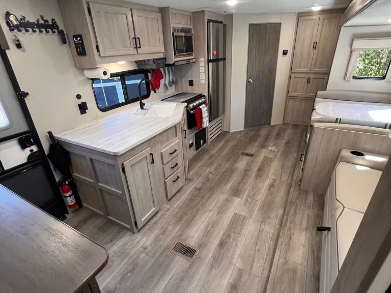 Welcome to our home on wheels. A great family experience in the outdoors along with the luxury of having all of your home amenities. Our trailer has a full-size super slide with both a dinette and sofa, a spacious rear bathroom with a walk-in shower, extra-large pantry/wardrobe storage, a oversized kitchen counter, and private bedroom. The half-ton friendly towing weight and under 30’ total length makes this camper perfect for weekend getaways!What's includedPots, pans and all cooking utensils