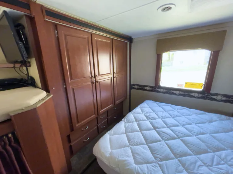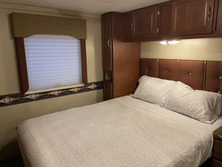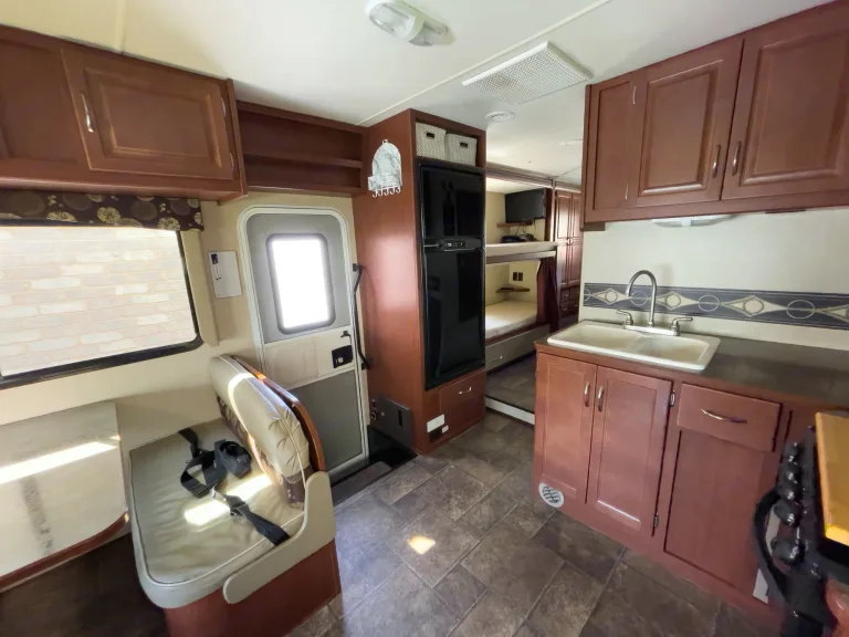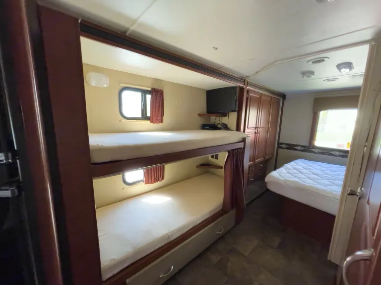 Take your big family or group on the vacation of a lifetime in The Bunkhouse! We have stocked the rig so you can just relax and enjoy the drive! The Bunkhouse sleeps 10 people (eight adults and two kids comfortably) and includes bed and bath linens for eight. We’ve also included all the basic kitchen items you will need to enjoy meals on the road. Don’t worry about travel boredom either, we have packed The Bunkhouse with a selection of family DVD’s, kids books, as well as indoor and outdoor games. We also include two camp chairs, an outdoor rug and table, and outdoor lights for the awning to help create the perfect campsite.There are 2 pop outs – one on each side that increase the kitchen/living room area as well as the bunkhouse hallway and master bedroom.The Bunkhouse is equipped with a backup camera and blind spot mirrors, which make driving this so easy. There are three TVs throughout: a 32-inch Smart TV above the cab (which can swing into living area), and two additional TVs in the bunks (one of which can swing into the master bedroom). Sleeping accommodations include a queen bed, a queen bed above cab, 2 bunk beds, dinette, and jack-knife sofa.The Bunkhouse is double-checked and ozoned after every rental to ensure everything is clean and in perfect working order for your trip.If there is anything else you’re interested in or would like, let us know! We want to help you create the perfect vacation!