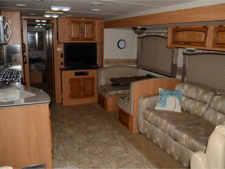 All you need are your clothes and food when you choose our very low mileage, 2 slide out RV that looks and feels brand new. Automatic self leveling once you get to your campsite. Fully Stocked with Pots/Pans/Cooking Utensils, Linens/Blankets, Towels, Shower Gel/Shampoo/Conditioner, Paper Plates/Plastic Utensils and even Coffee provided. Very spacious and sleeps 6. Couch and Dining Table fold out into beds. Queen size bed in the master. 2 Televisions with dvd players and movies. Shower is roomy, (I'm 6'3" and it's no problem for me.) Generator onboard if needed and it powers everything including the 2 roof ACs. She's ready for a weekend camping getaway, or a week long trek. Tons of storage both inside and out. A BBQ pit and large outdoor rug for use under the electric awning also included. Fire Extinguishers and Smoke/Carbon Monoxide detectors onboard. Delivery and Setup available at your site. Internet is available for a $50 flat fee up to 7 days.