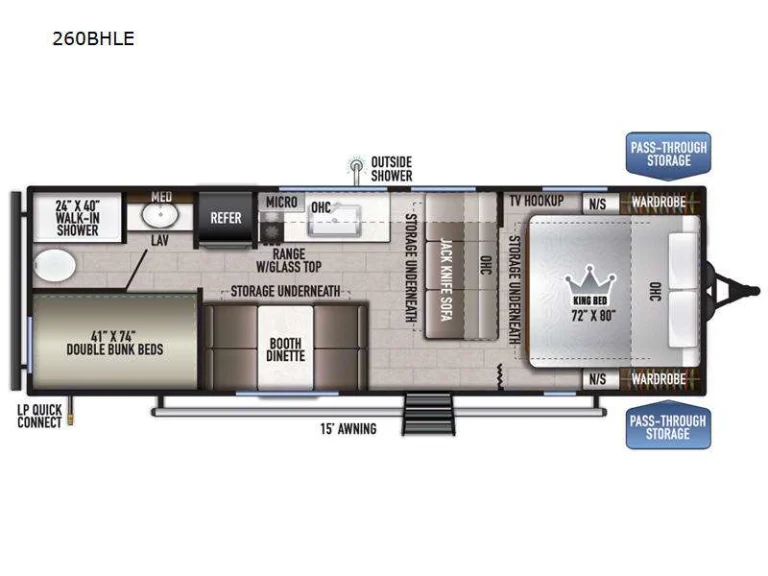Exterior features: An 11-foot power awning with LED lights, a power tongue jack with an LED light, and a pass-through storage compartment are included. The trailer is also pre-wired for a backup camera.