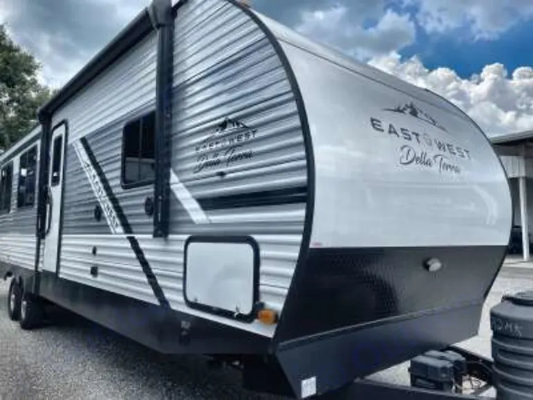 The 2023 East to West Della Terra 292MK is a spacious travel trailer designed for extended-stay comfort, featuring opposing slides that open up the main living area and a private front king-size bedroom. A key feature is the "MK" or "Mid-Kitchen" layout, which centers the kitchen around a large island.