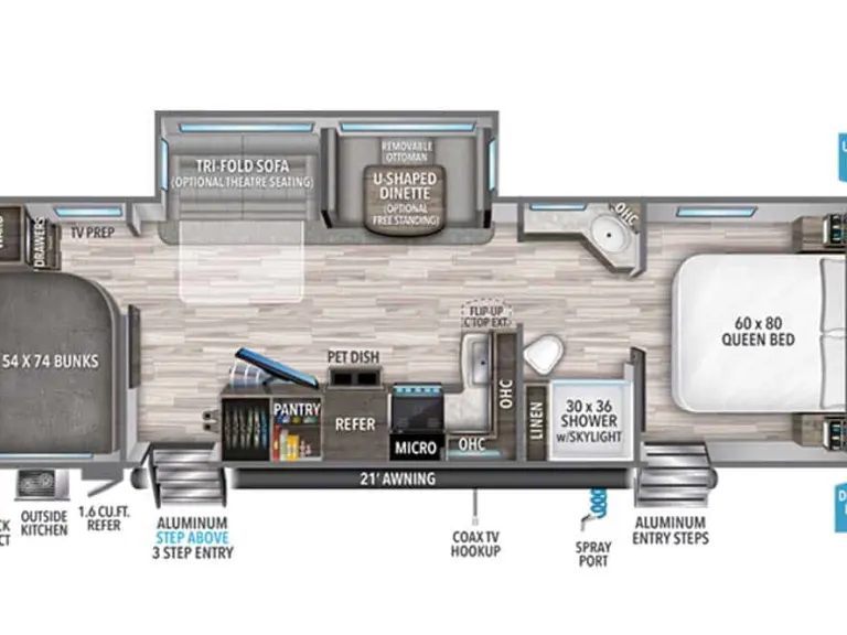 Solar PowerWith this Imagine travel trailer, you won't have to imagine what a great camping trip will be like because you can live it! The kitchen includes everything you will need to prepare a meal for everyone, like a 10-cubic foot refrigerator, three-burner range with oven, microwave, stainless steel sink, and flip-up countertop extension. There is a pet dish below the refrigerator, and the LED Hdtv sits across from the tri-fold sofa and U-shaped dinette with removable ottoman so that you can watch a movie or the big game in comfort. Another great addition is the private bunkhouse because it provides you with a second secluded sleeping space. This bunkhouse includes a wardrobe, and drawers. What's includedCookware, camping chairs, fold out table. Other things to noteDelivery and pickup available upon request.