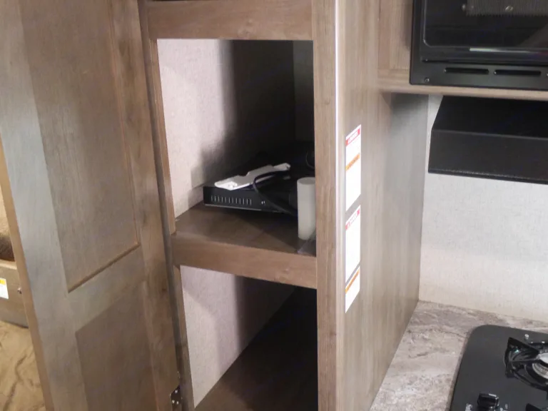 Tons of storage space with cabinets in the kitchen and above the table as well as storage compartments underneath the couch, both booth seats and under the RV. There are also closets on each side of the queen bed.